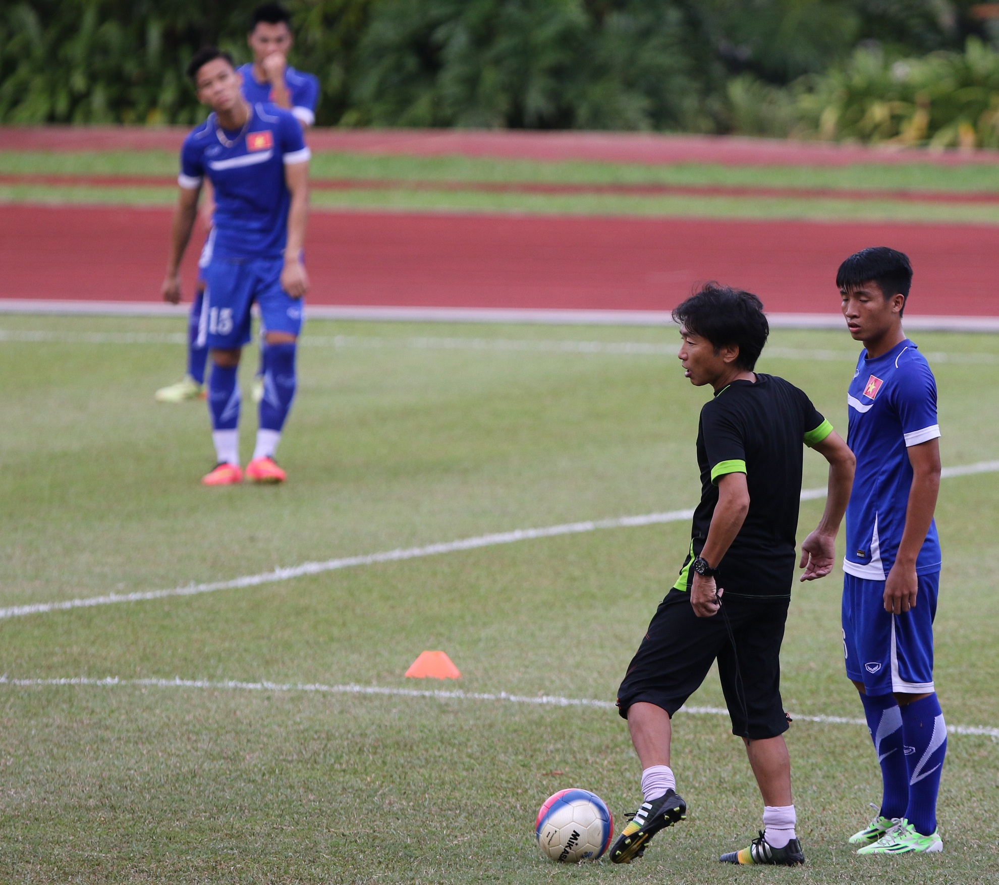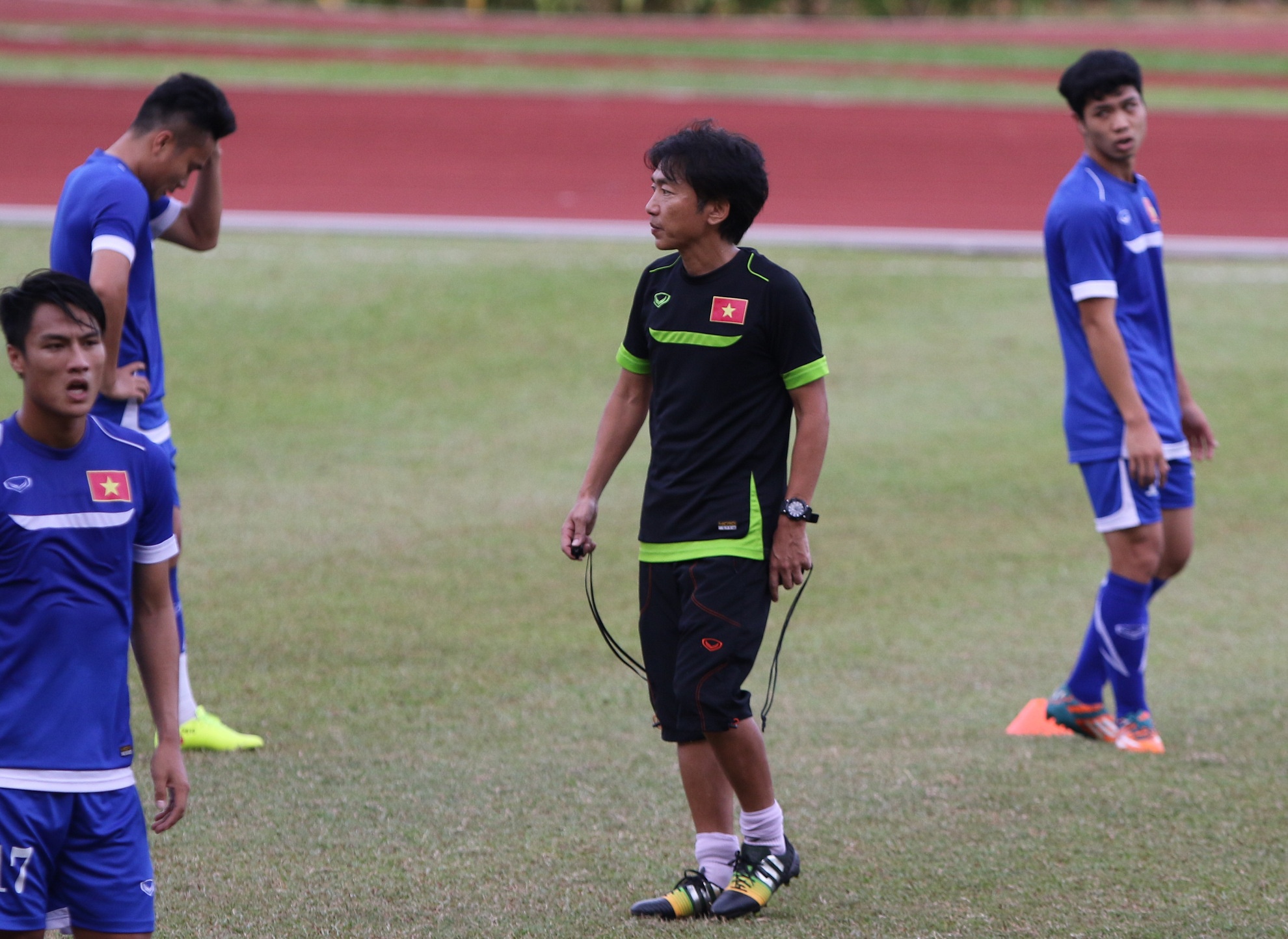 | Trong buổi tập chiến thuật, ông nhắc nhở Phi Sơn nhiều lần vì thực hiện sai ý đồ chiến thuật. Mục tiêu của chiến lược gia người Nhật Bản là các hậu vệ và tiền vệ chịu khó chuyền bóng qua lại nhằm kéo giãn đội hình đối phương. |
