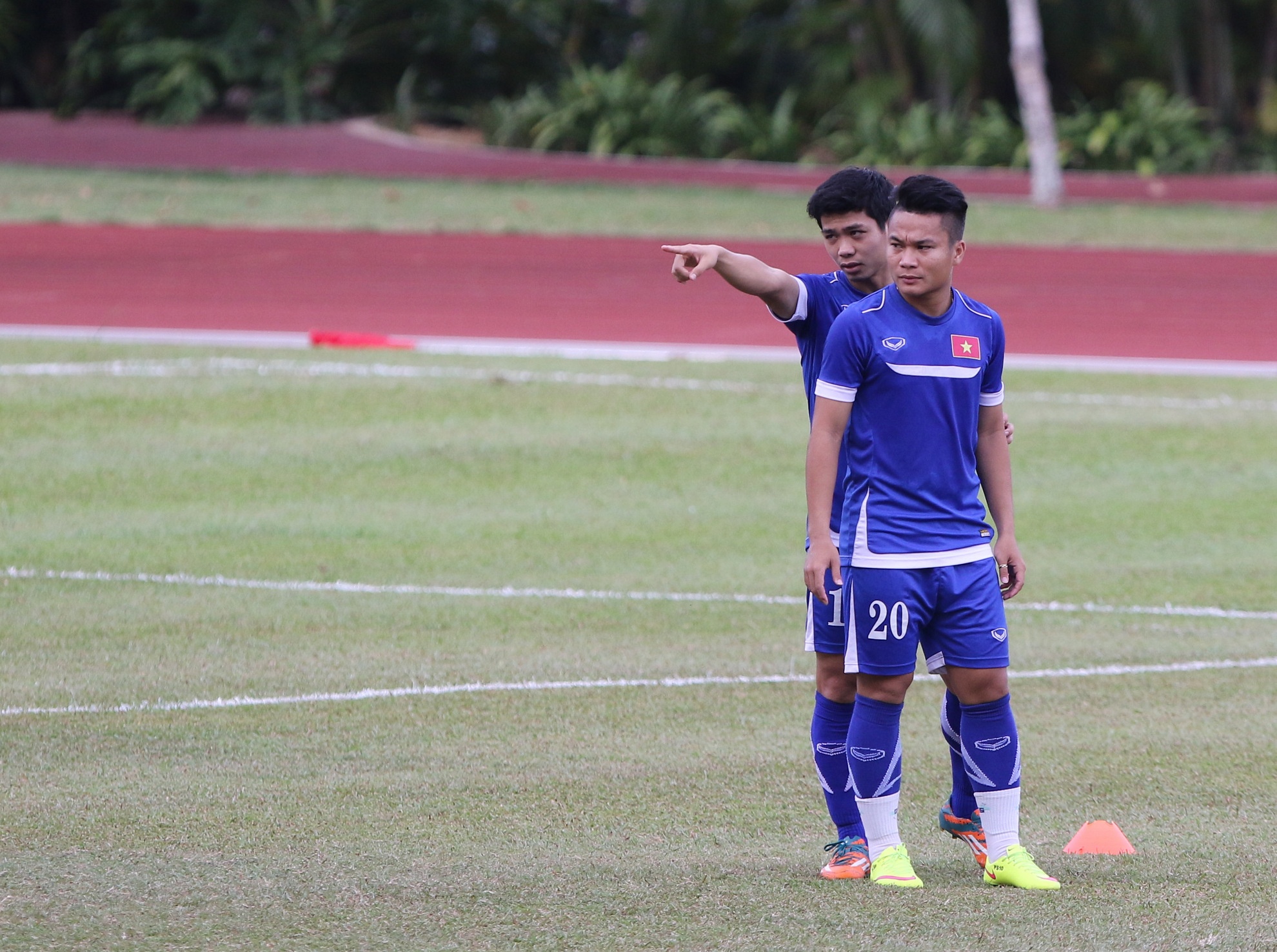 | Minh Tùng (trái) và Thanh Bình đều không tham gia buổi tập trước trận gặp Đông Timor vì cả hai cùng bị đau mắt cá. |