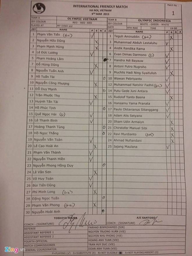 | Bản danh sách ĐT Olympic Việt Nam trong trận giao hữu quốc tế gặp Indonesia thiếu vị trí số 6 của Xuân Trường, trong khi các cầu thủ bị chấn thương khác vẫn có tên. |