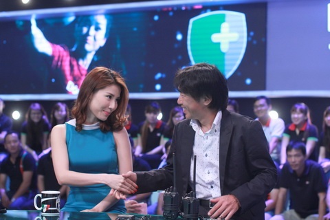 Nữ diễn viên, người mẫu Diễm My 9x tỏ ra e lệ khi được ngồi cạnh HLV Toshiya Miura trong chương trình "Đội tuyển tôi yêu". Ảnh: Thùy Minh