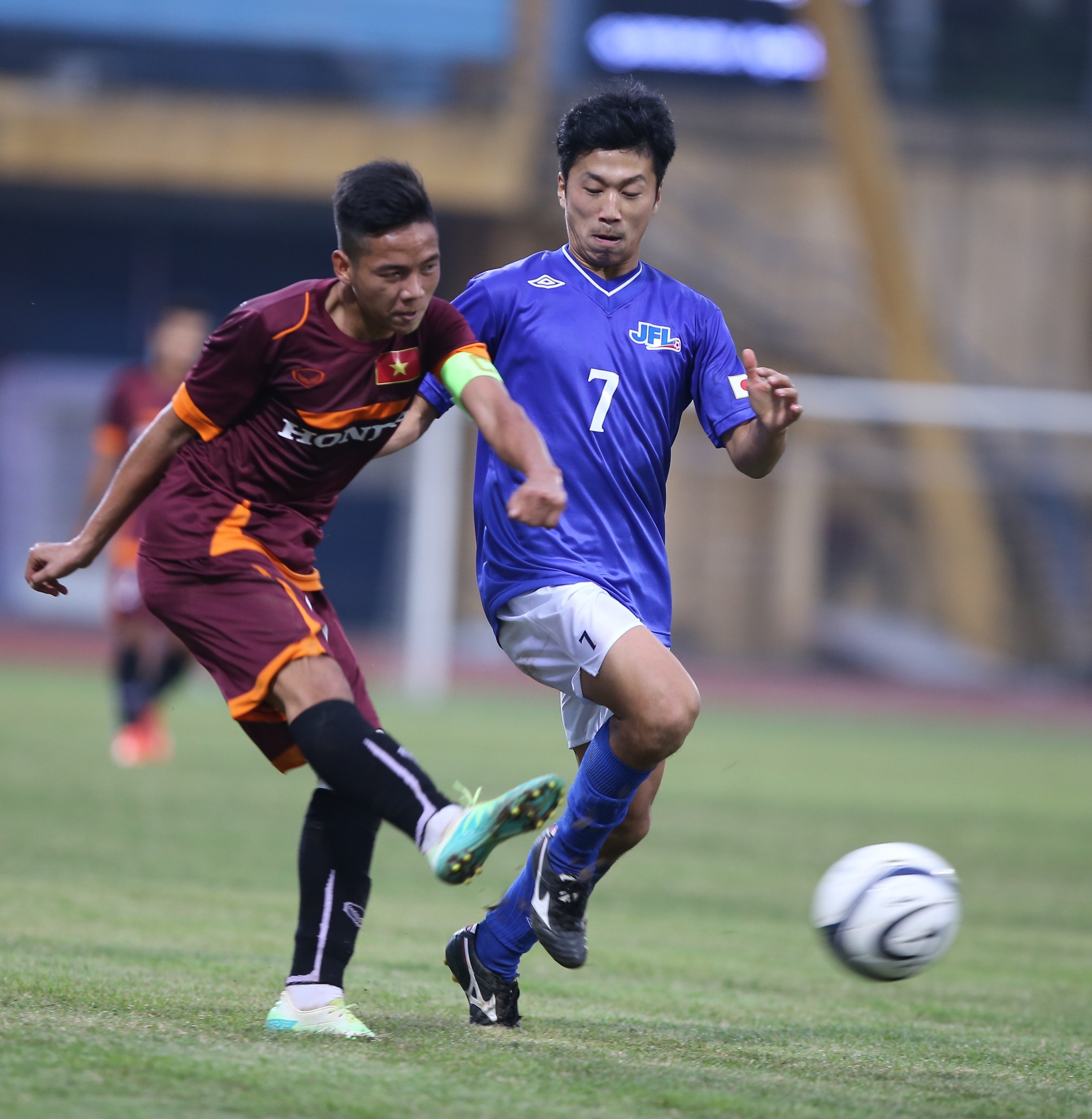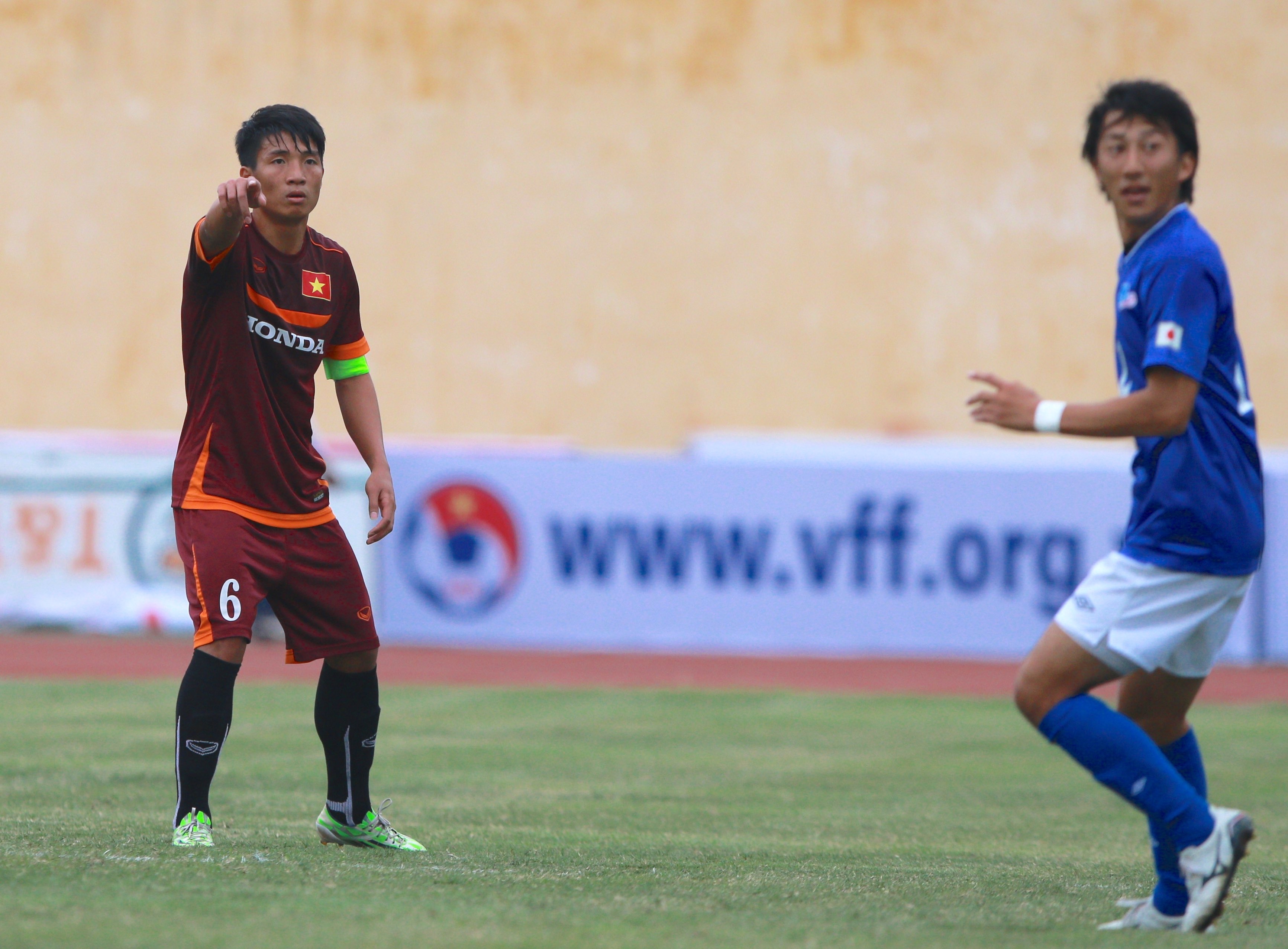 | Trung vệ Tiến Dũng mang băng đội trưởng U23 Việt Nam ở hiệp 1 trận đấu với JFL Selection chiều 14/12. |