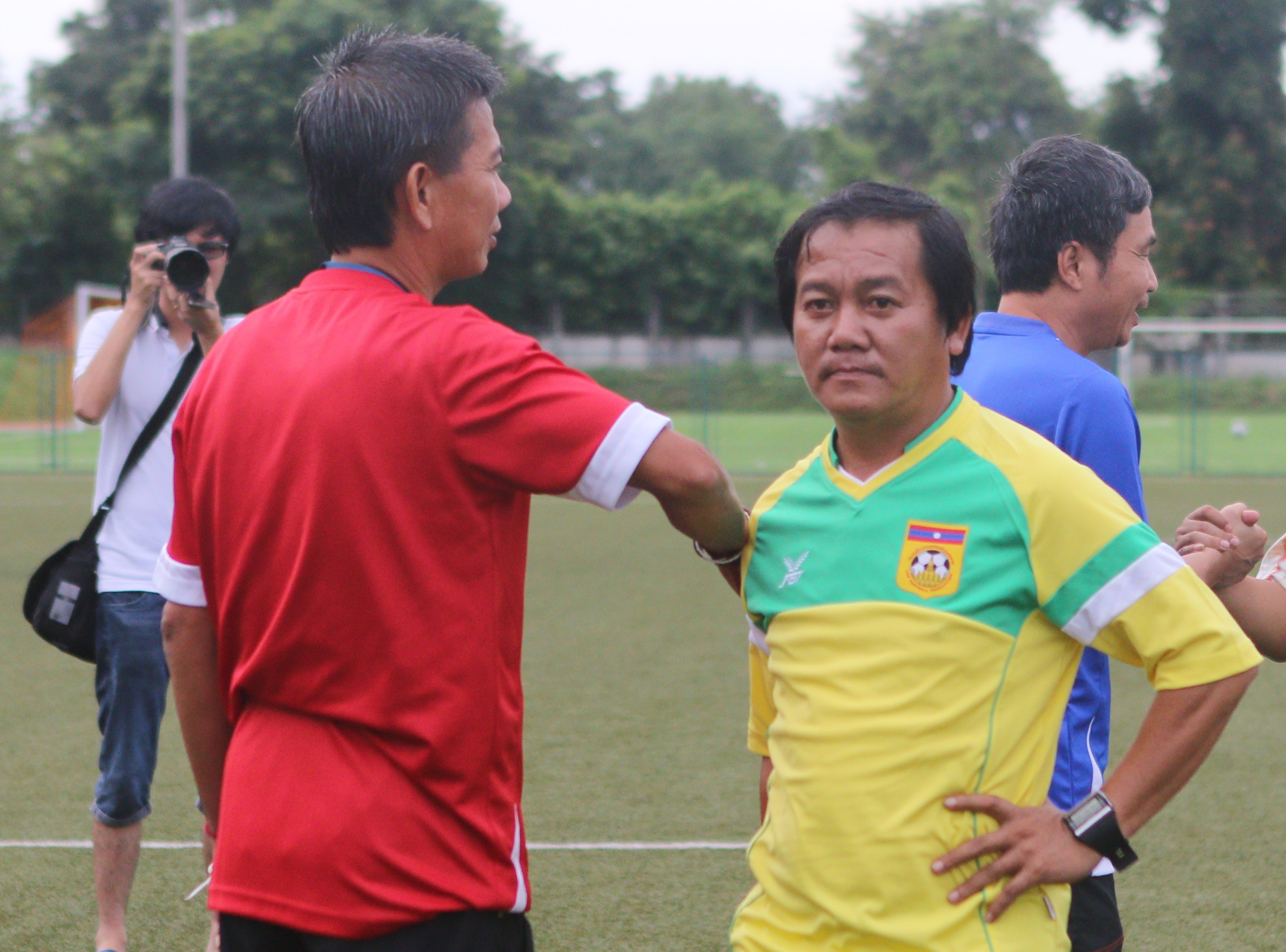 | HLV trưởng U19 Việt Nam - ông Hoàng Anh Tuấn chào hỏi thân mật HLV Phan Tôn Lợi (áo vàng) khi gặp nhau trên sân tập tại Liên đoàn bóng đá Lào. |