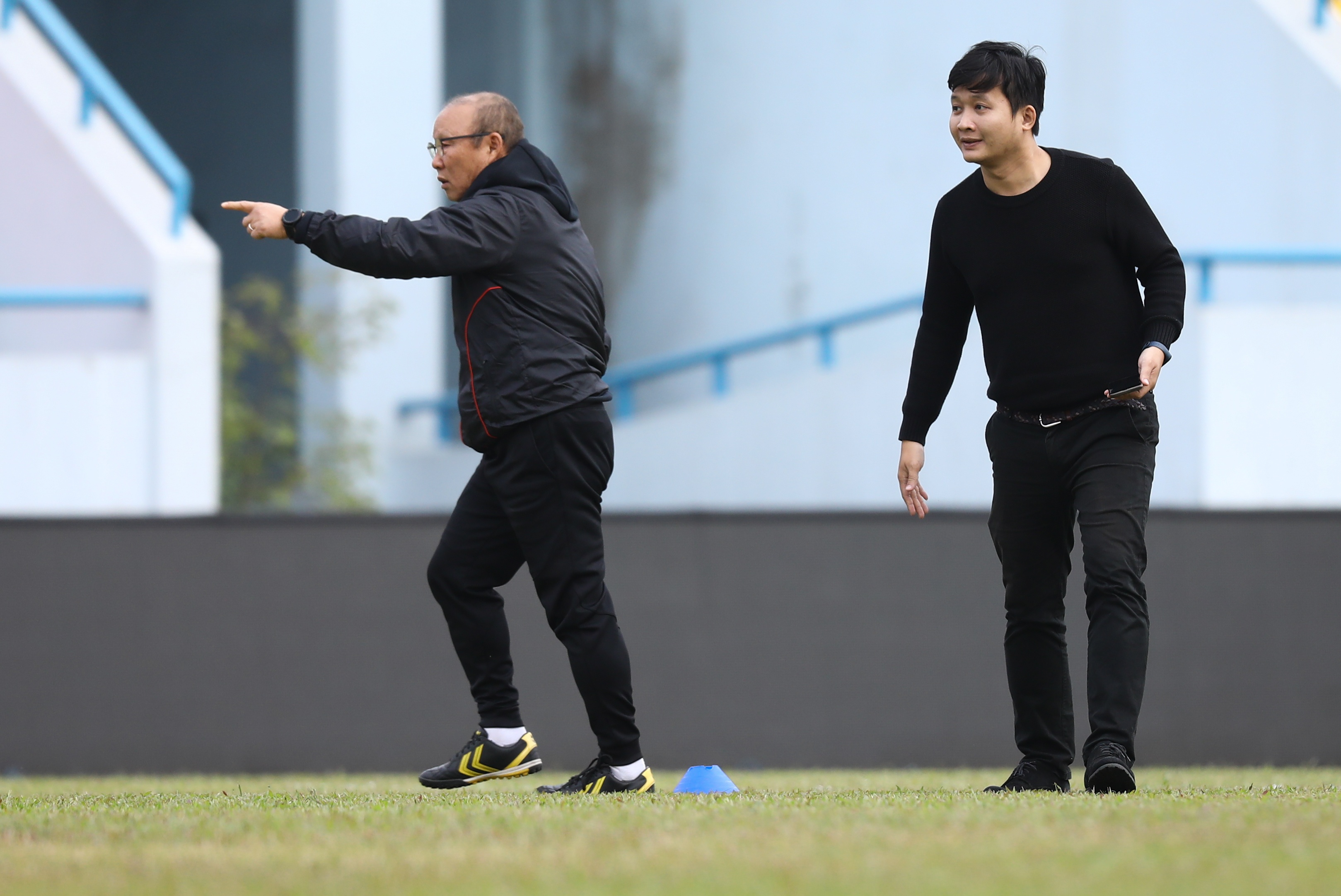 | HLV Park trao nhiệm vụ huấn luyện trực tiếp cho trợ lý Kim Han-yoon. Ông dành thời gian đi một vòng sân, xem tình trạng mặt cỏ và kiểm tra cơ sở vật chất trên sân. |