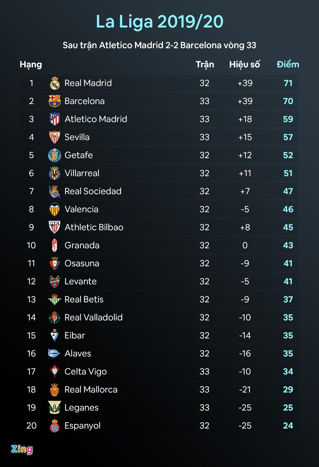 Barca hiện có 70 điểm sau 33 vòng đấu tại La Liga 2019/20, ít hơn 1 điểm so với đội đầu bảng Real Madrid nhưng thi đấu nhiều hơn 1 trận.