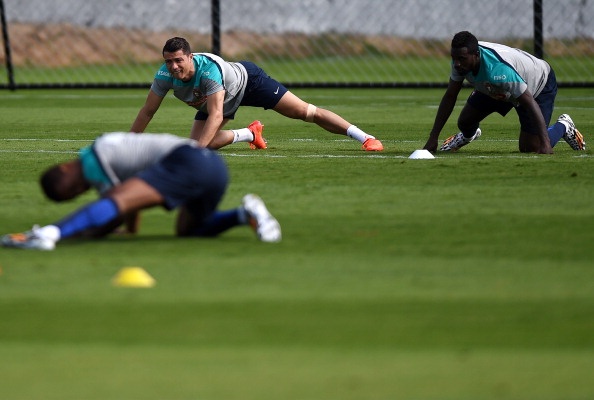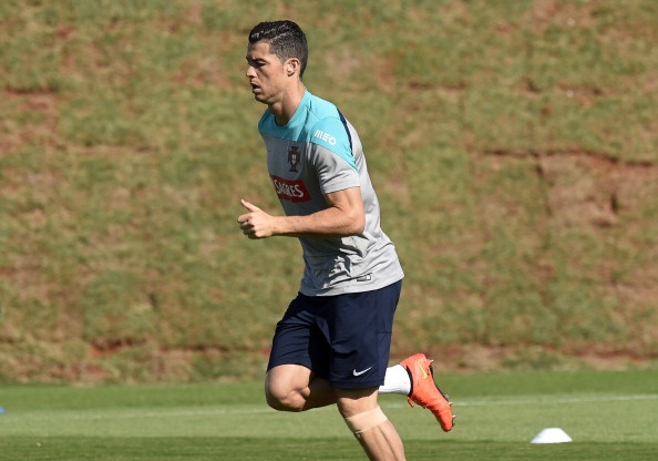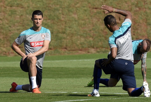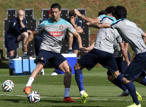 Vẻ mặt căng thẳng của Ronaldo sau khi hoàn tất buổi tập. Trong trận gặp Mỹ, Bồ Đào Nha sẽ không có sự phục vụ của ba cầu thủ quan trọng gồm Coentrao, Hugo Almeida (chấn thương) và Pepe (treo giò).
