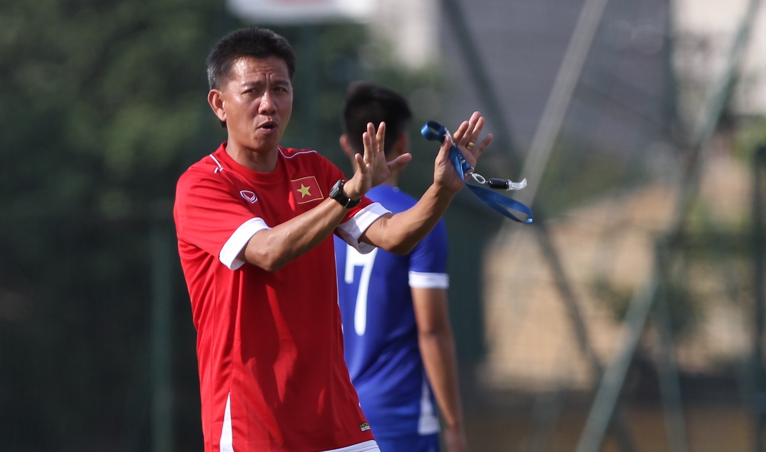 | Trên sân Trung tâm đào tạo trẻ VFF, HLV Hoàng Anh Tuấn chỉ đạo học trò tập luyện dưới cái nắng oi ả của Hà Nội. |