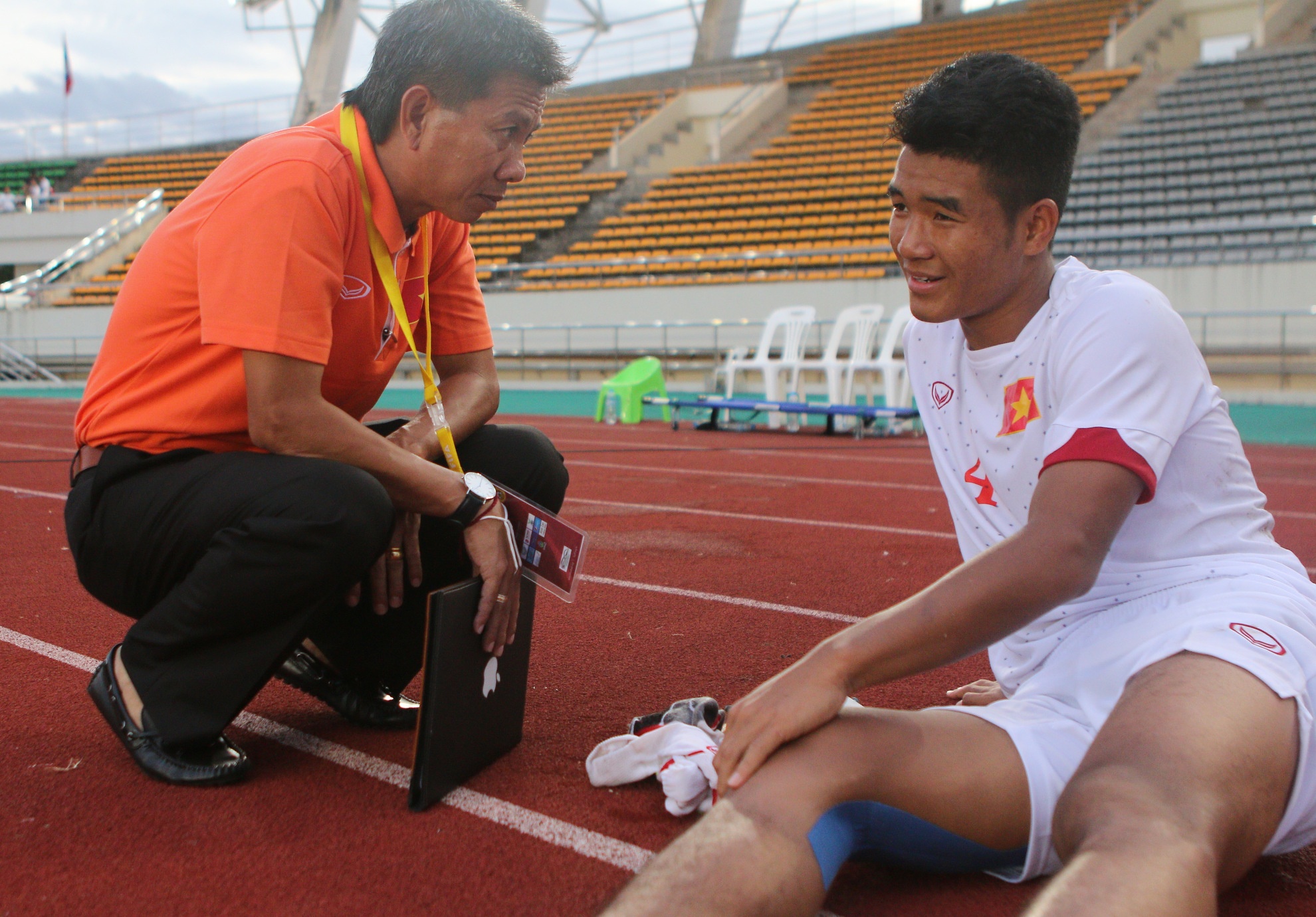 | HLV Hoàng Anh Tuấn tới động viên tiền đạo Đức Chinh. |