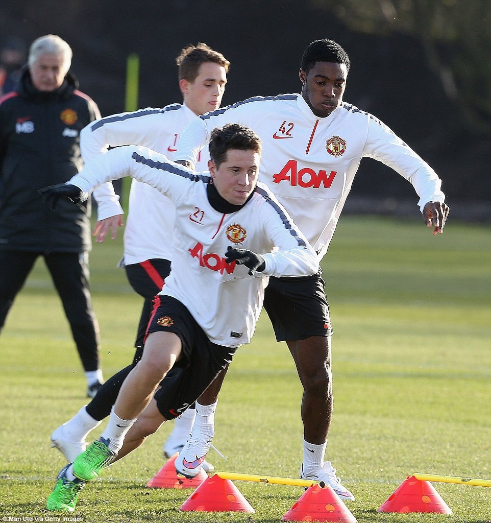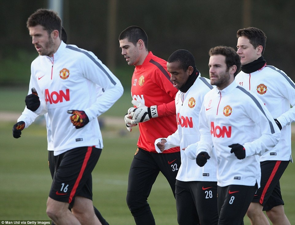 Michael Carrick, Victor Valdes, Anderson, Juan Mata và Ander Herrera trong buổi tập chiều qua của M.U.