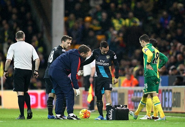Ngoài Alexis Sanchez, Santi Cazorla cũng dính chấn thương đầu gối khá nặng. Cựu tiền vệ Villarreal thậm chí phải đáp chuyến bay trở về Tây Ban Nha để nhờ bác sĩ phẫu thuật nổi tiếng Ramon Cugat kiểm tra. Theo chẩn đoán ban đầu, Cazorla sẽ phải ngồi ngoài ít nhất 4 tháng hoặc đến hết mùa giải.