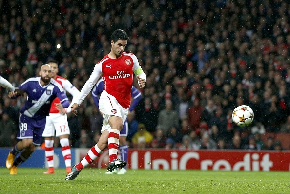 | Trên chấm 11 m, thủ quân Mikel Arteta dễ dàng đánh bại thủ thành Silvio Proto mở tỷ số trận đấu. |