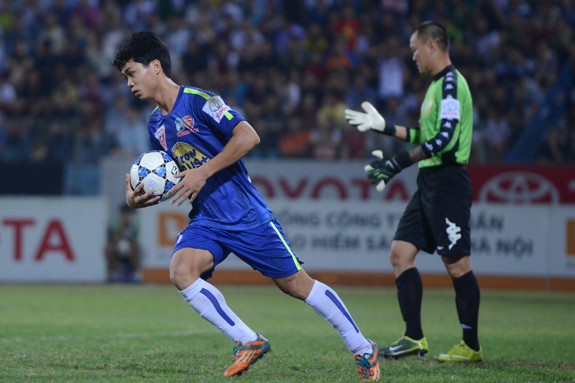 | Hàng tiền đạo Hà Nội T&T thể hiện sự vượt trội trước hàng thủ yếu kém của HAGL khi Samson liên tiếp đột phá vượt qua cả hậu vệ và thủ môn trước khi bị phạm lỗi dẫn tới quả penaty cho đội nhà. Văn Quyết dễ dàng ghi bàn từ chấm 11 m để nâng tỷ số lên 3-0. |