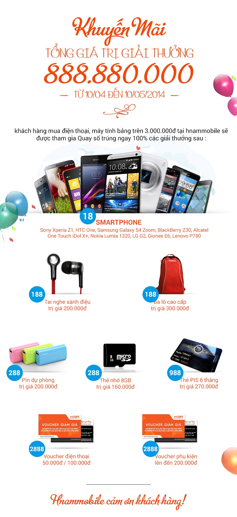 Từ ngày 10/4 - 10/5 khi tham quan mua sắm điện thoại, máy tính bảng có giá trị từ 3 triệu đồng trở lên tại Hnam Mobile, khách hàng sẽ có cơ hội tham gia quay số trúng 100% với hàng ngàn giải thưởng giá trị lên đến 888.880.000 đồng.