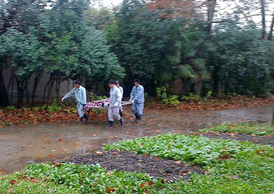| Nhân viên y tế khiêng xác ông Châu ra khỏi chuồng của con hổ Hoa Nam sau khi vụ tấn công xảy ra. Ảnh: REX |