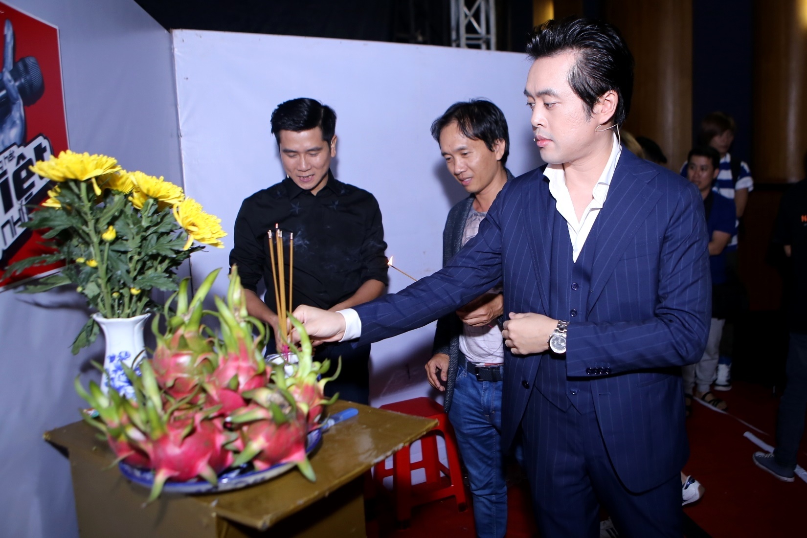 Nhạc sĩ Dương Khắc Linh diện vest tối màu lịch lãm. Anh thắp nén hương trước giờ lên sóng. Lần đầu đảm nhận vai trò giám khảo chương trình tìm kiếm tài năng nhí, chủ nhân hit Xin hãy thứ tha gây bất ngờ với khả năng nói chuyện thuyết phục và hài hước.
