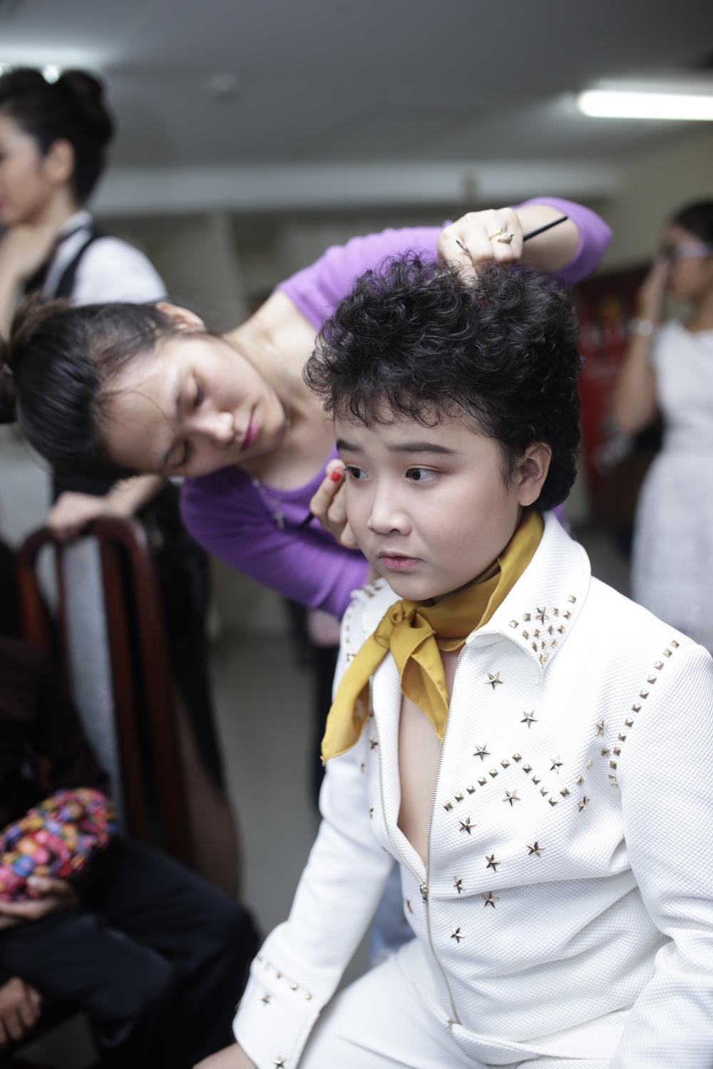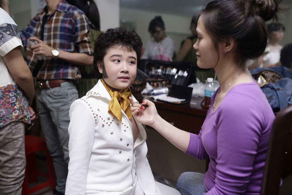 Cậu bé Hoàng Anh tóc xù đang được chuyên viên hóa trang chuẩn bị cho màn trình diễn của mình. Trong đêm nay, em sẽ hóa thân thành hình tượng của ông hoàng nhạc rock and roll Evis Presley.