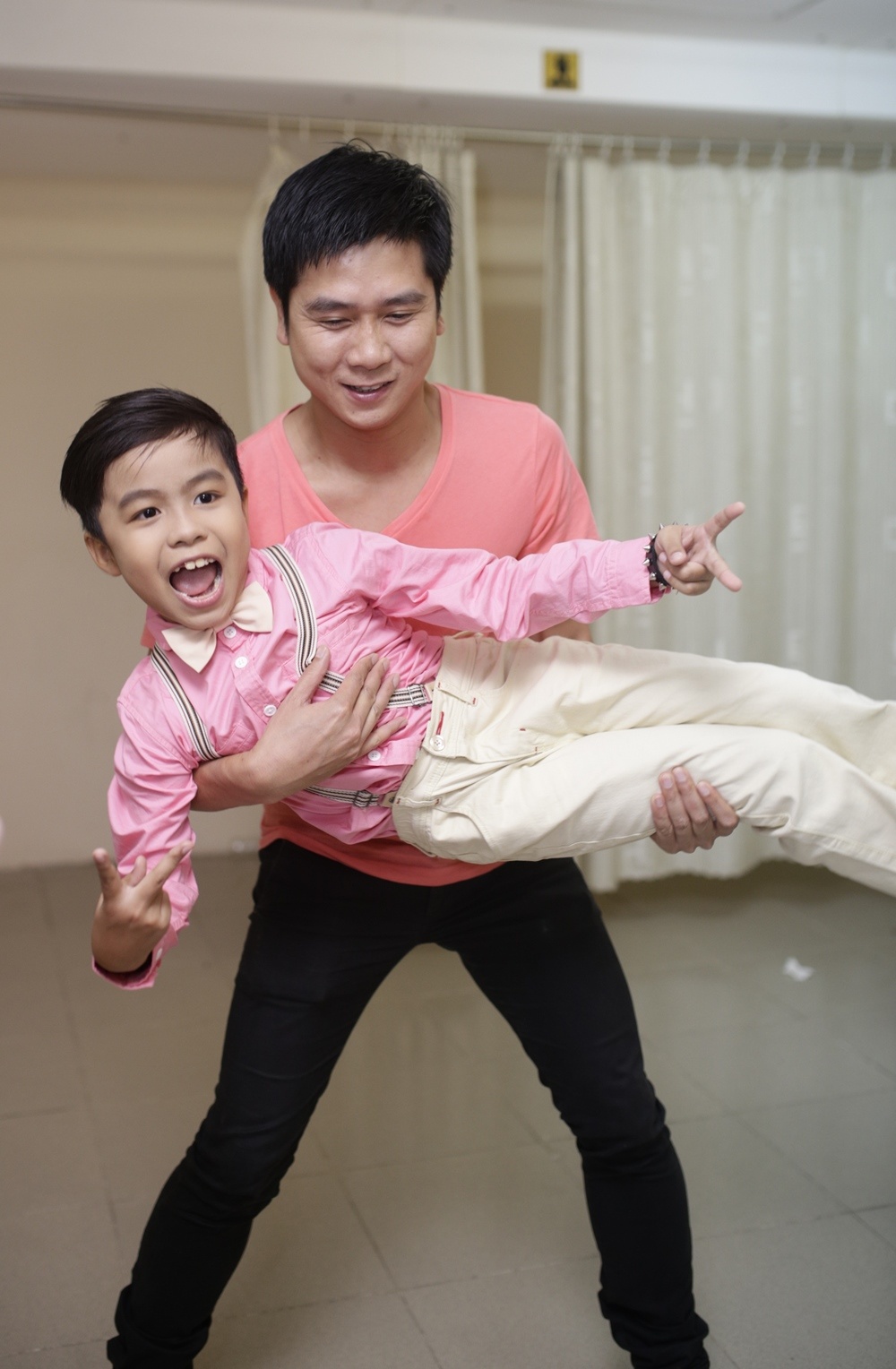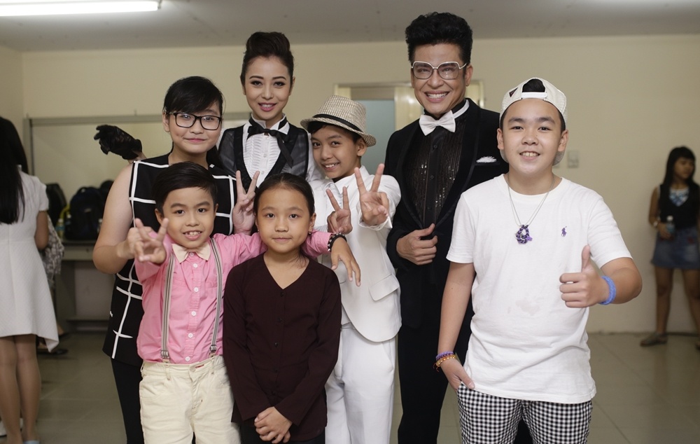 | Để gỡ bỏ tâm lý lo lắng và căng thẳng cho các thí sinh nhí trước giờ G, trong hậu trường, nhạc sĩ Hồ Hoài Anh đã "bày trò", trêu đùa với các bạn nhỏ. Cậu bé Gia Phúc được anh bế bổng lến chụp ảnh xì-tin. |
