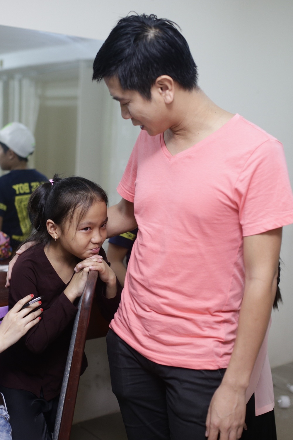 | Anh cũng tranh thủ trò chuyện với các bạn nhỏ trước khi lên sân khấu. |