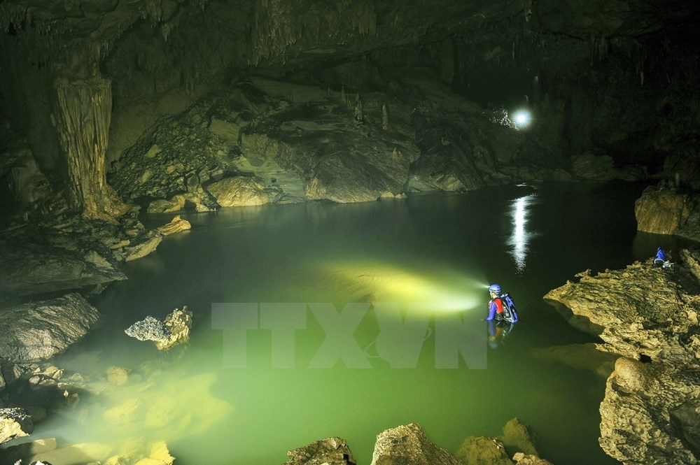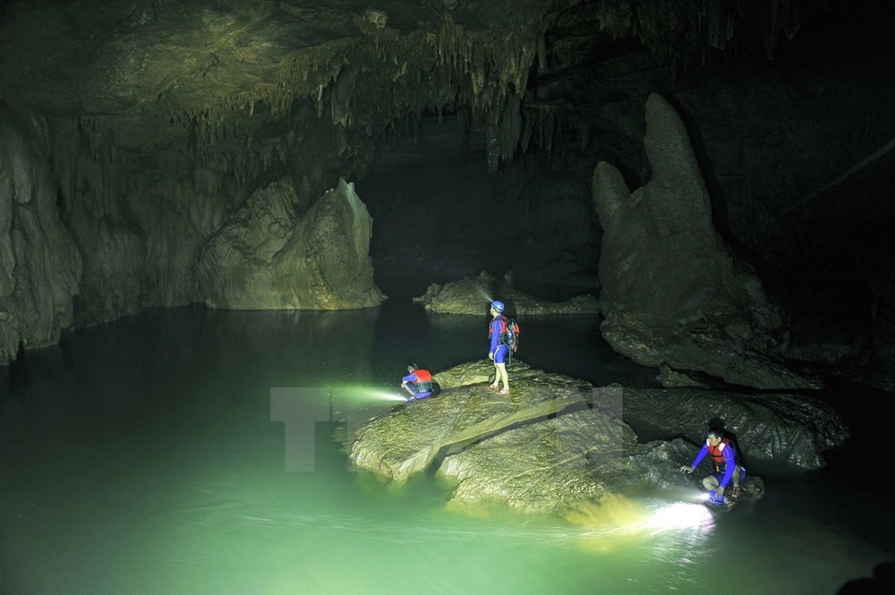 | Đắm mình trong làn nước xanh ngắt, mát lạnh của hồ trong động như lạc vào nơi mà mặt nước, trần hang động và các bãi đá khổng lồ hòa hợp làm một. |
