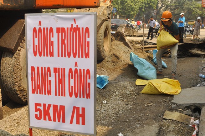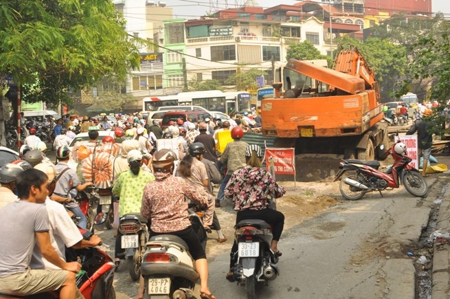| Hố tử thần gây tắc nghẽn kéo dài tại Hà Nội sáng 4/10. |
