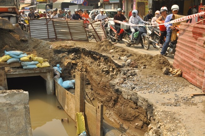 | Các vật liệu vẫn còn ngổn ngang tại hiện trường. Ngay sau khi biết sự việc, đội công an giao thông số 4 đã huy động lực lượng phân làn đường giảm tải ùn tắc. Và chắn bờ đất bằng các tấm sắt hạn chế sụt lún đất xung quanh. |