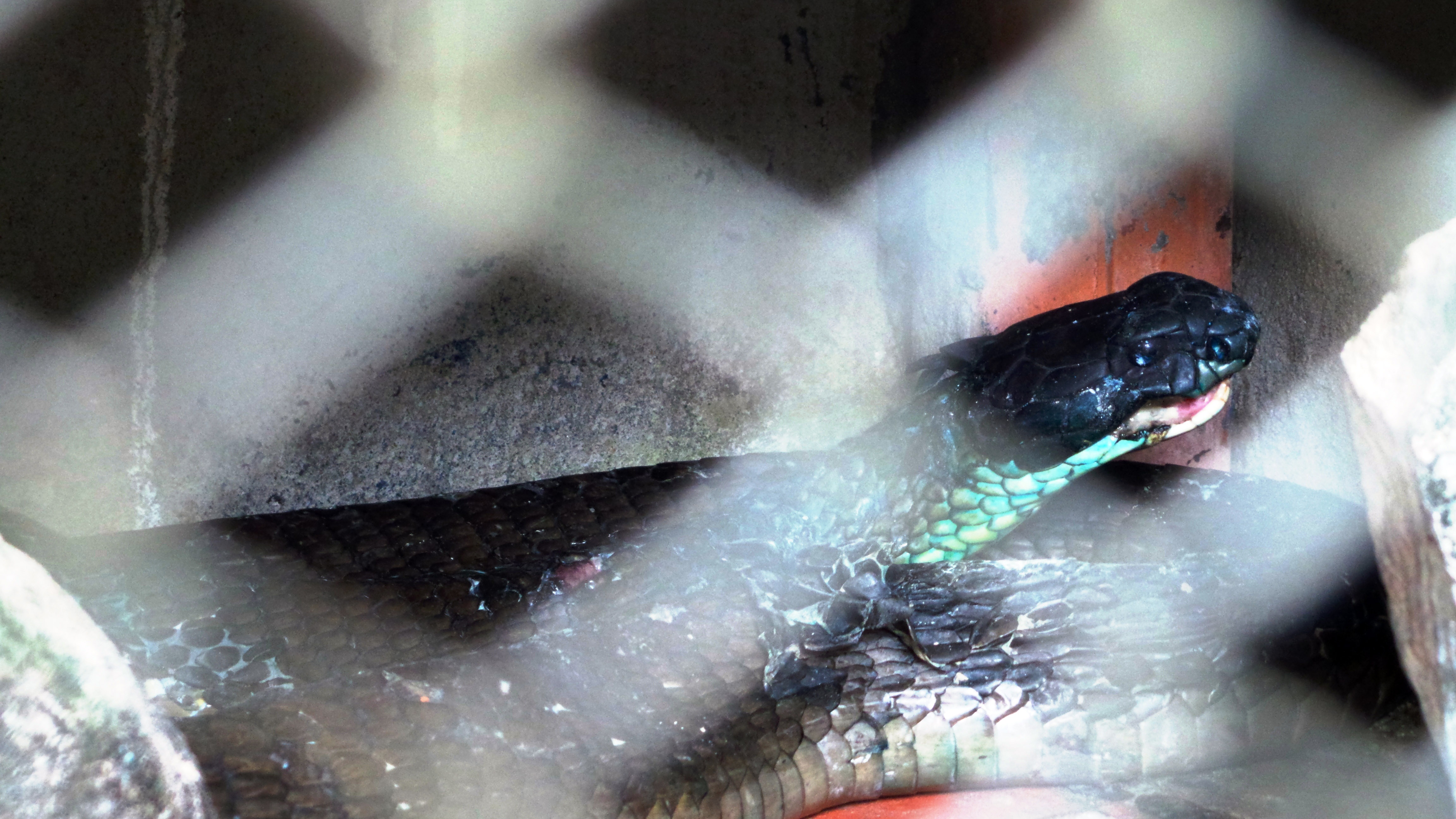 Con hổ mang chúa nặng hơn 6 kg, dài 3,1 m bị xuyên dây thép khâu miệng, thân bỏng do người dân chích điện đang được chăm sóc với chế độ đặc biệt tại trại rắn Đồng Tâm (Tiền Giang).