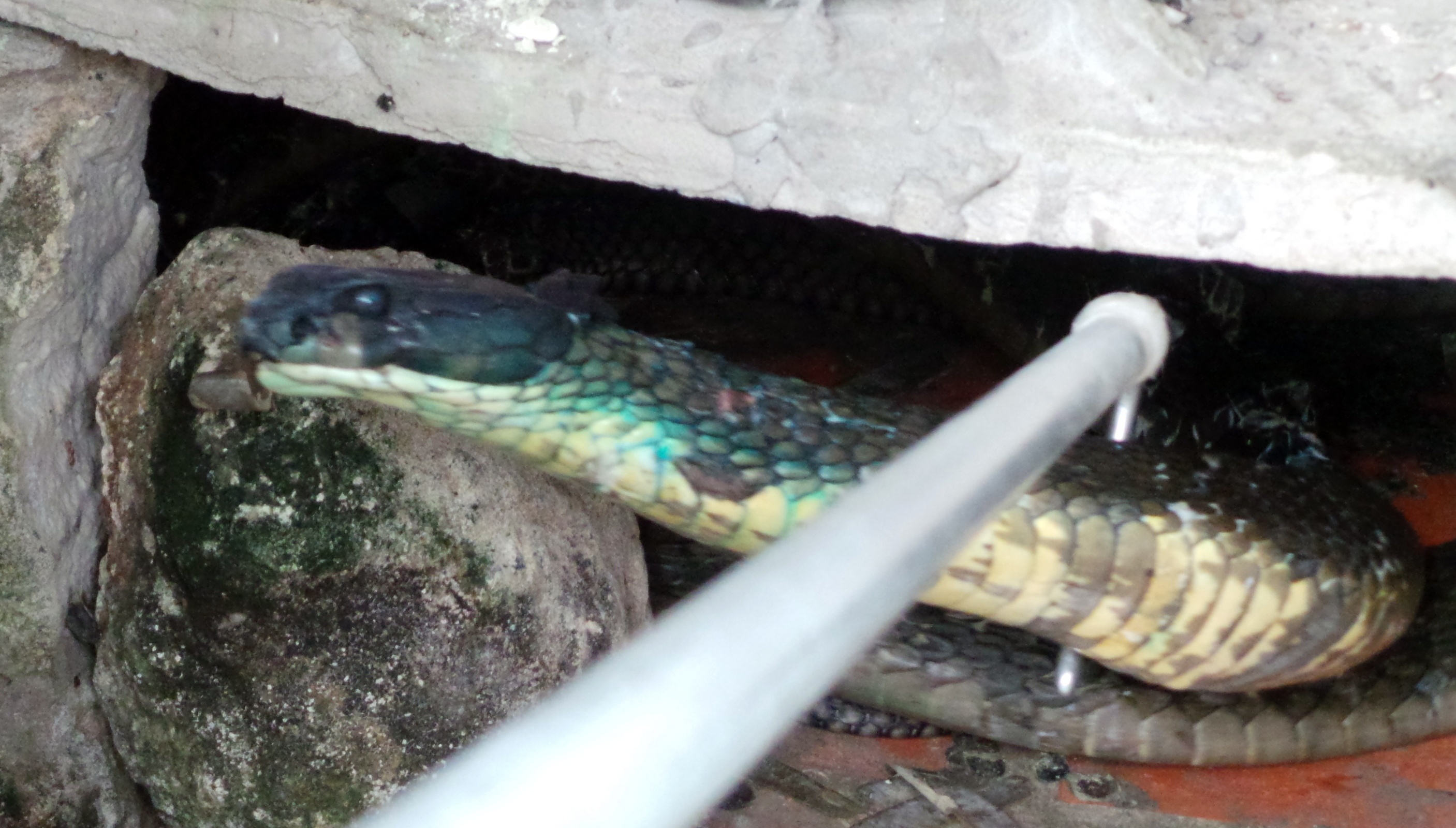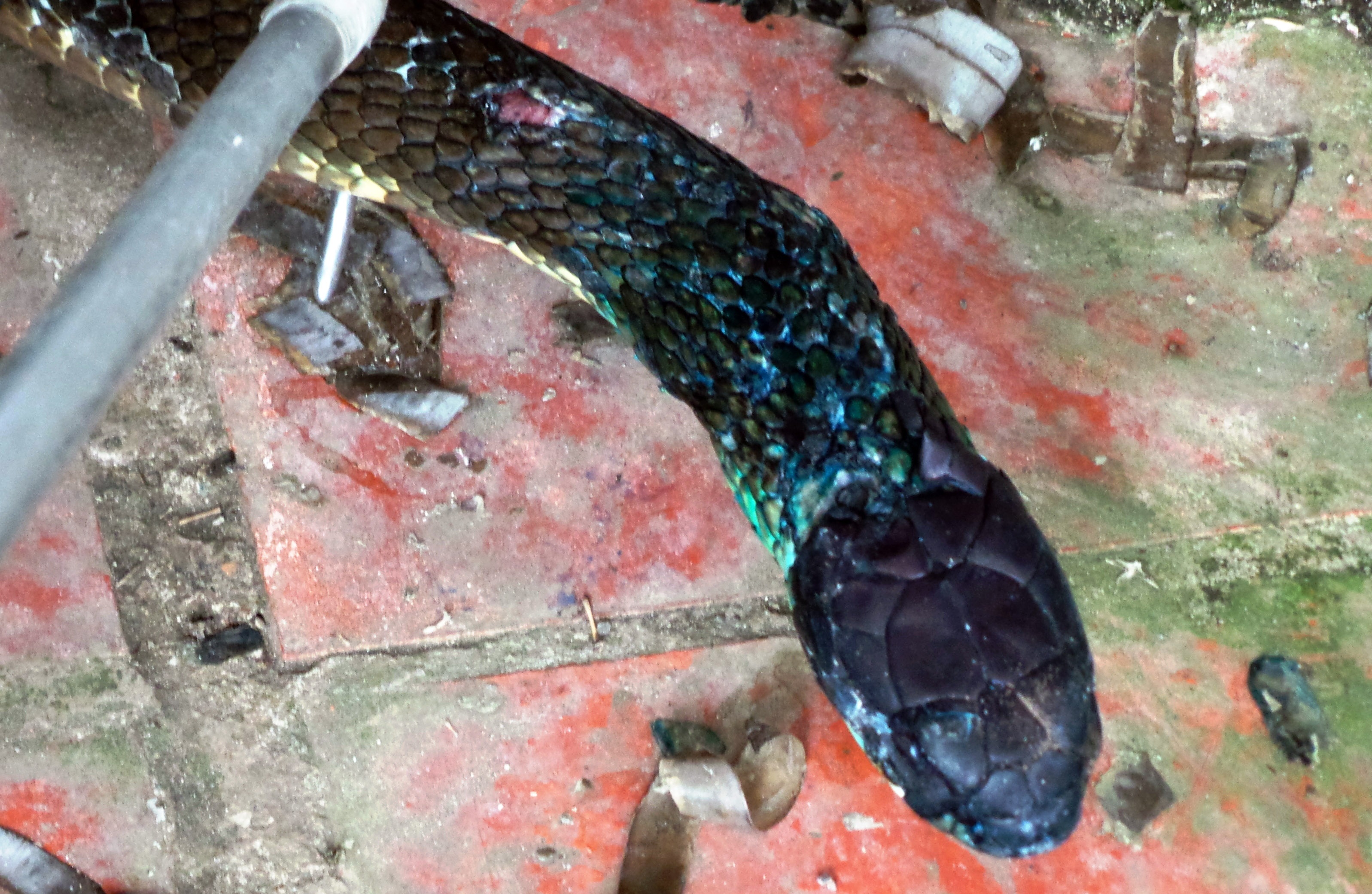 | Khi được đưa về trại Đồng Tâm, hổ mang chúa khổng lồ này có nhiều vết thương. Nó bị người dân xuyên dây thép khâu miệng để khỏi cắn người, chĩa đâm thủng lỗ lớn cách đầu khoảng 5 cm và bị chích điện gây bỏng. Ảnh: Minh Anh. |