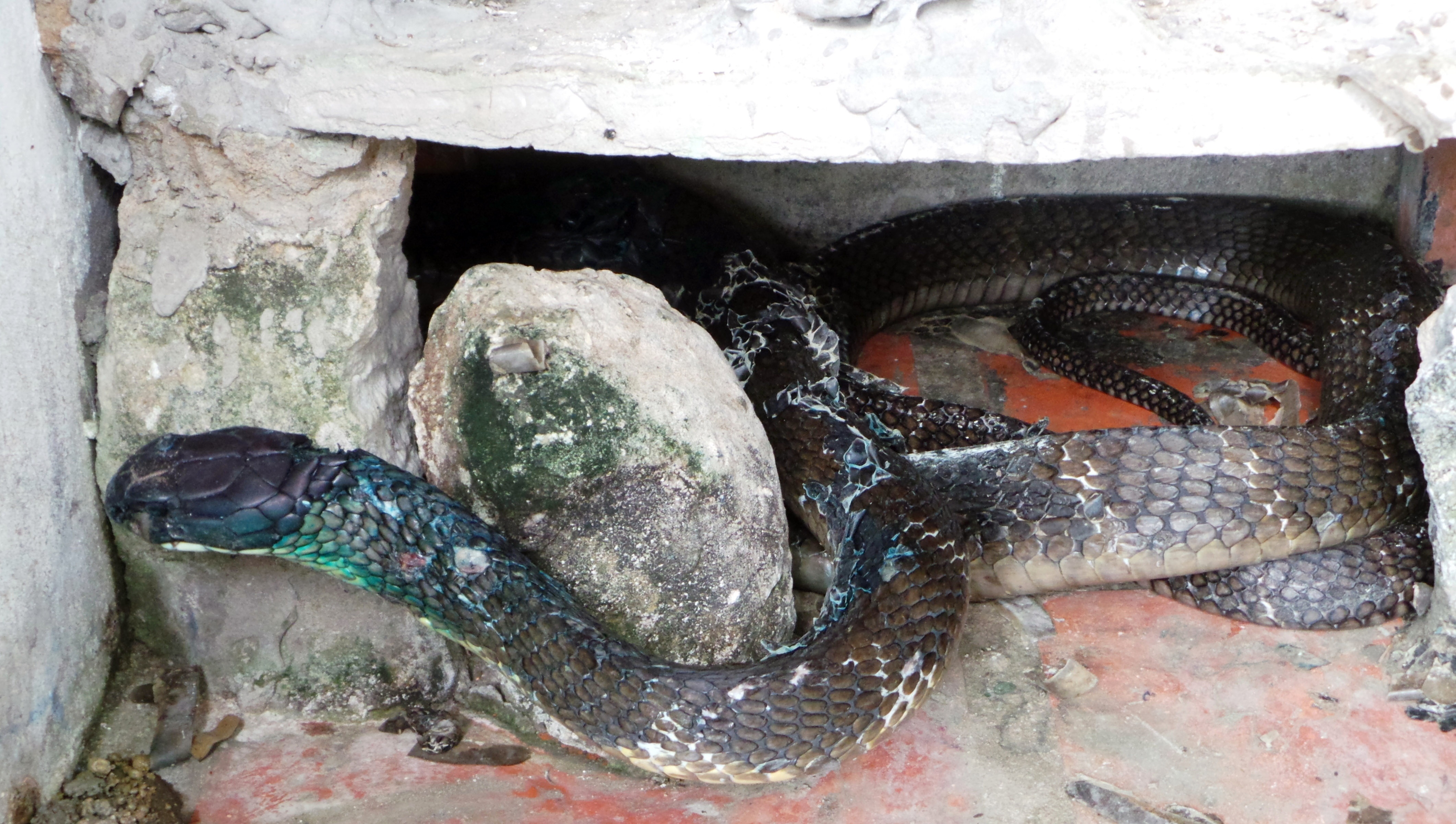| Sau gần 2 tháng được đưa về trại Đồng Tâm, hổ mang chúa đã hồi phục hơn 80%, có thể di chuyển tốt, các vết thương ngoài da đã lành. Tuy nhiên nó vẫn chưa thể tự ăn do miệng bị nhiễm trùng. |