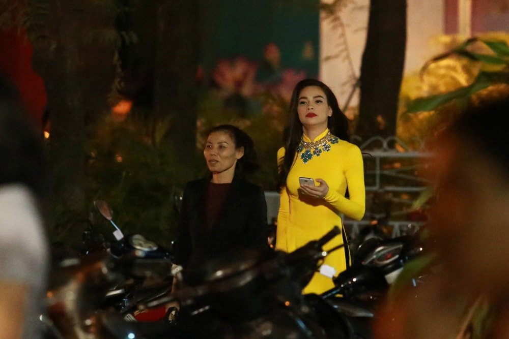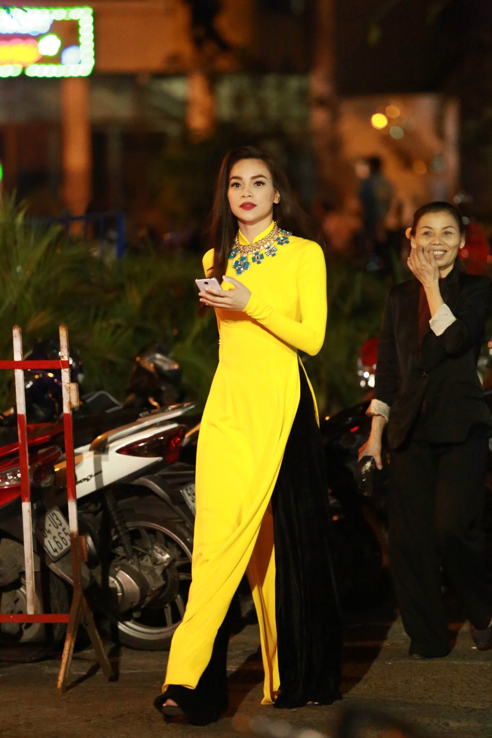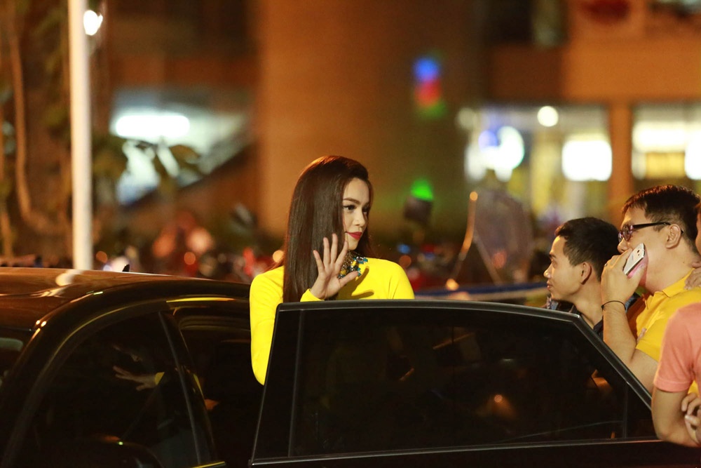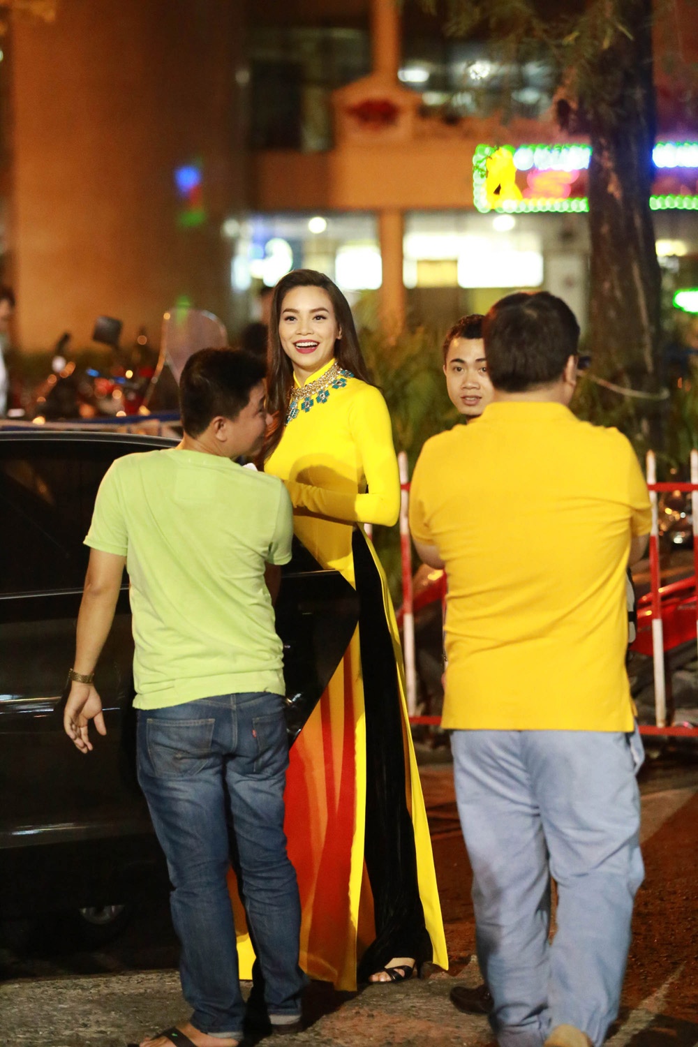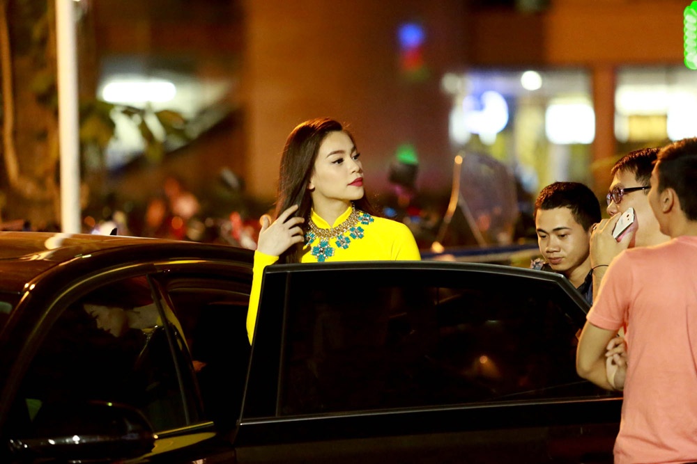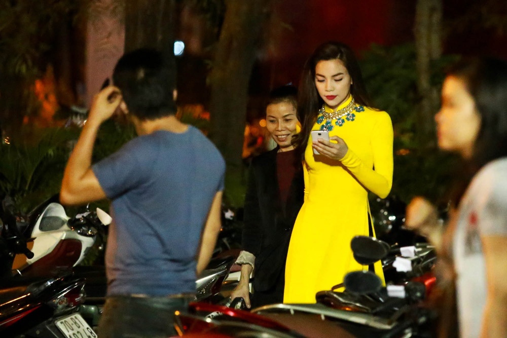 Hồ Ngọc Hà xinh đẹp và nổi bật trong chiếc áo dài vàng rực rỡ. Cô vừa xuống xe đã có nhiều fan đến hỏi thăm, trò chuyện.