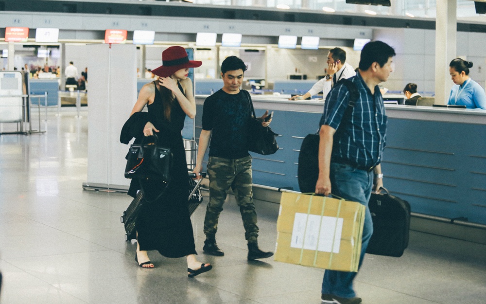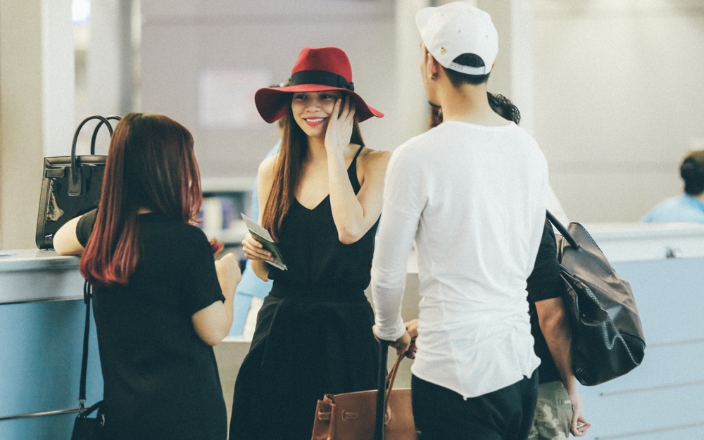 Hồ Ngọc Hà cùng nhà thiết kế Lý Quí Khánh và ê-kíp trang điểm, nhiếp ảnh đáp chuyến bay sang Mỹ công tác. Có mặt tại cổng hàng không quốc tế Tân Sơn Nhất, bà mẹ một con diện váy hai dây tối màu gợi cảm. Cô đội mũ fedora rộng vành cá tính.