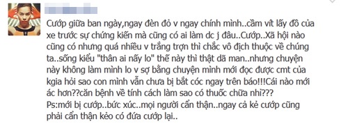 Hồ Ngọc Hà còn chia sẻ thêm một câu chuyện mà cô cho là vô cùng độc ác: "Nhưng chuyện này không làm mình lo và sợ bằng chuyện mình mới đọc được bình luận của khán giả hỏi, vì sao con mình vẫn chưa bị bắt cóc ngay trên báo. Cái nào mới ác hơn? Căn bệnh về tính cách làm sao có thuốc chữa nhỉ? P/s: Mới bị cướp. Bức xúc. Mọi người cẩn thận. Ngay cả kẻ cướp cũng phải cẩn thận kẻo có đứa cướp lại".