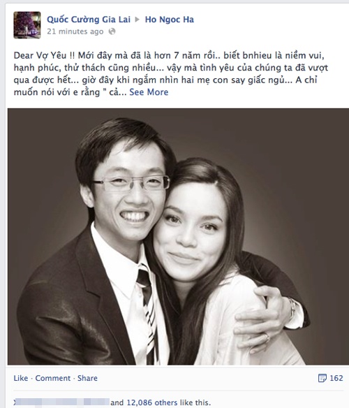 Doanh nhân Quốc Cường luôn tỏ ra là người tình lãng mạn chu đáo, anh không ngần ngại bày tỏ tình cảm với Hồ Ngọc Hà trên mạng xã hội, các đám tiệc, sự kiện của giới showbiz.