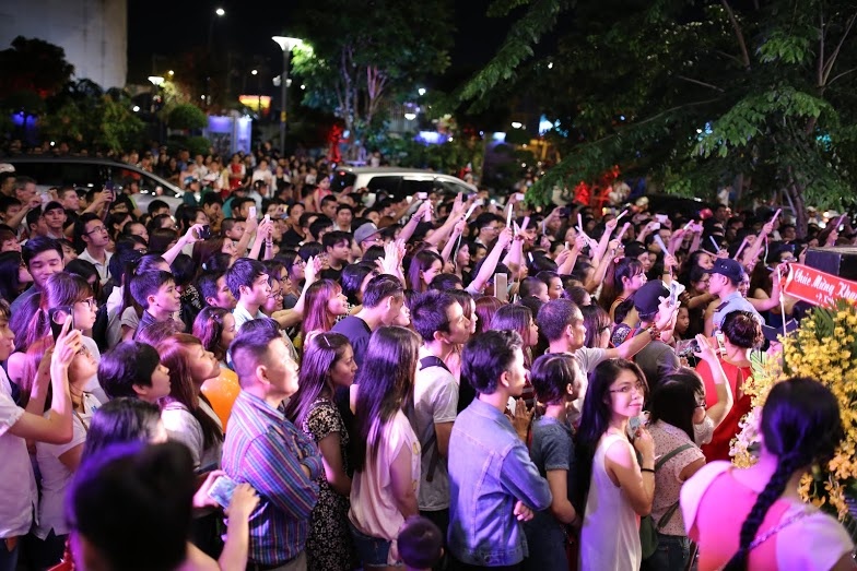 Vừa qua, phố đi bộ Nguyễn Huệ dường như nghiêng hẳn về phía bờ sông Bạch Đằng. Ngay từ lúc MC Quang Bảo bắt đầu cầm micro giới thiệu lễ khai trương nhà hàng DQ Grill & Chill, khách bộ hành đã kéo đến đông nghịt. Fan của hai ca sĩ khách mời là Thanh Duy Idol và Hồ Ngọc Hà cũng đến từ rất sớm, dành những chỗ đứng tốt nhất trước khán đài.