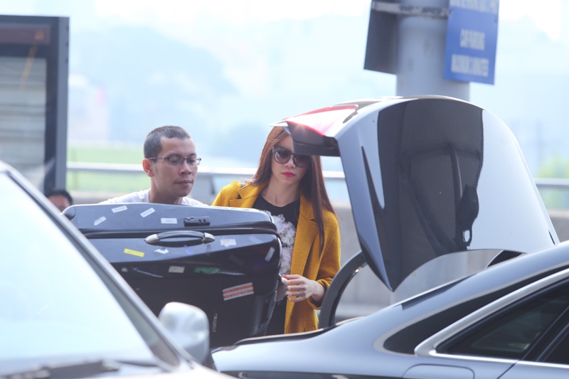 Người tài xế giúp Hồ Ngọc Hà đưa vali hành lý vào sảnh chờ, cô diện áo vest vàng mustard cá tính bên ngoài bộ đồ đen.