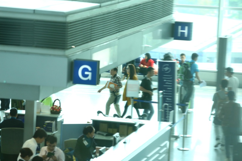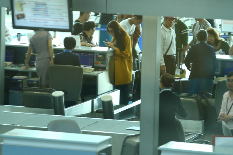 | Hồ Ngọc Hà bận rộn với điện thoại trong khi V.Music và ê-kíp hoàn thành thủ tục xuất cảnh và check-in để lên máy bay. |