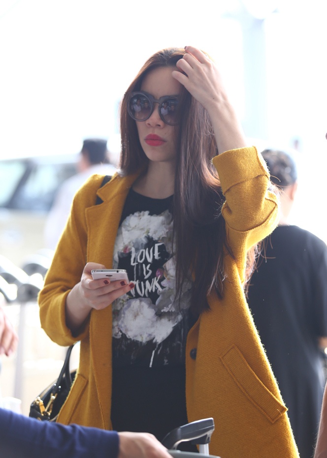 Nữ ca sĩ tranh thủ kiểm tra điện thoại trước khi làm thủ tục xuất cảnh. Hồ Ngọc Hà vừa có sự kết hợp rất đặc biệt cùng Thủy Tiên và Minh Hằng với ca khúc Như hoa mùa xuân của nhạc sĩ Châu Đăng Khoa. Ca khúc này sẽ xuất hiện trong album Gala nhạc Việt mừng xuân 2014.