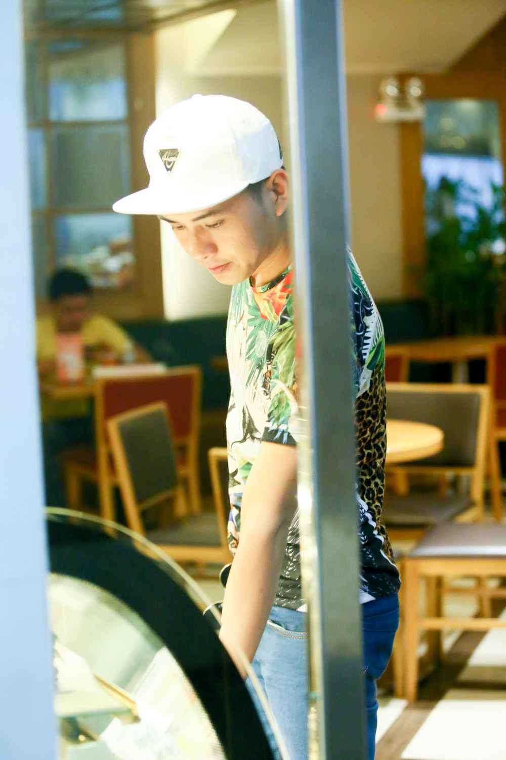 | Anh tiến vào quán cà phê trong Trung tâm thương mại, nơi gặp gỡ hội bạn bè. |