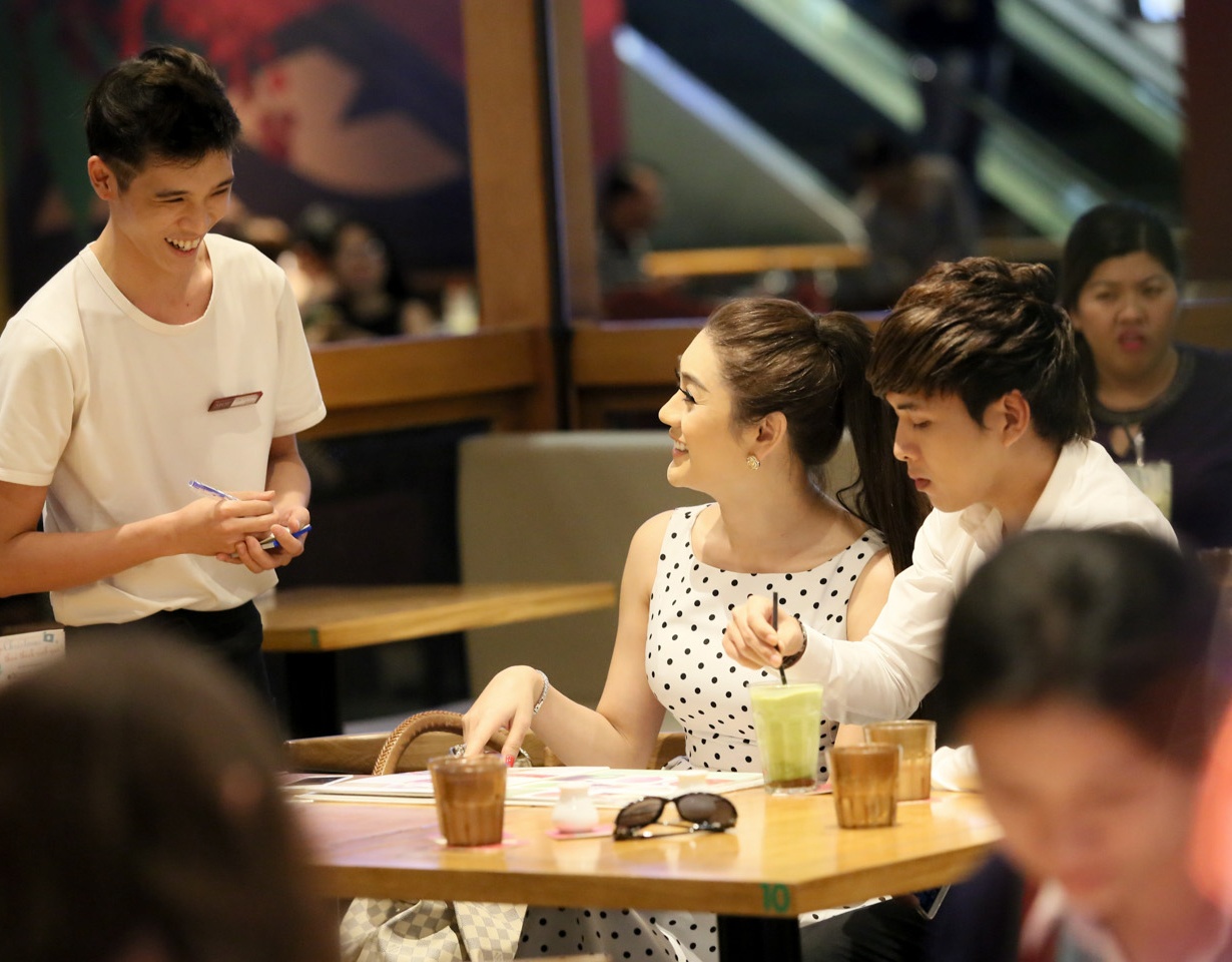 | Chiều 13/12, nam ca sĩ Con bướm xuân và người đẹp chuyển giới Lâm Chi Khanh hẹn hò một vài người bạn tại trung tâm thương mại quận 1, TP.HCM. Cặp đôi đến khá sớm, gọi đồ uống và chờ đợi mọi người. Lâm Chi Khanh vui khi được nhân viên phục vụ nhận ra hai người. |