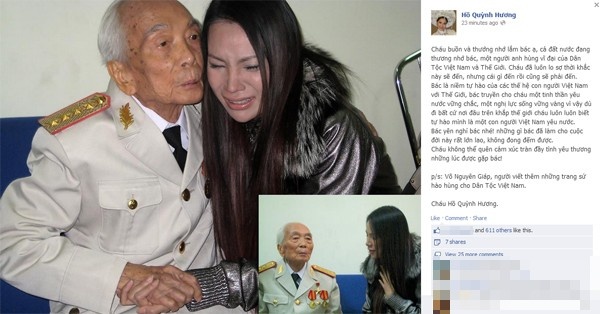 Trên Facebook cá nhân, Hồ Quỳnh Hương đã chia sẻ những cảm xúc khi biết tin Đại tướng Võ Nguyên Giáp qua đời. Cô cũng giống như rất nhiều người dân Việt Nam xót xa và lặng người không tin là vị tướng tài của dân tộc Việt Nam đã qua đời.