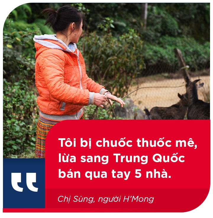 Khác với 2 trường hợp trên, chị Sùng lại bị lừa bán sang Trung Quốc theo cách công khai và liều lĩnh. Cuối năm 2017, sau thời gian làm quen, kết bạn và trao đổi cùng một người lạ qua điện thoại, chị Sùng có cuộc hẹn cùng người này. Vừa uống ngụm nước, chị đã ngất đi, mê man. Tỉnh dậy, chị mới biết mình đã bị đưa sang Trung Quốc.