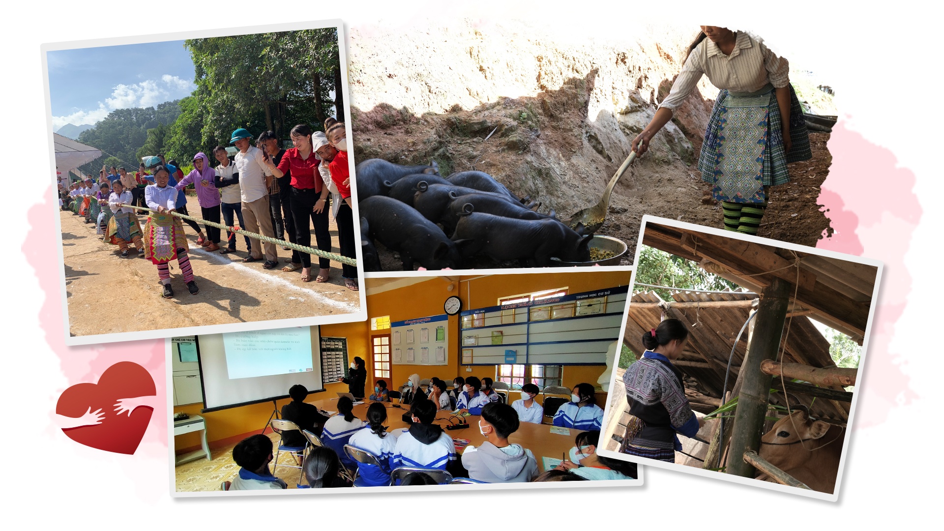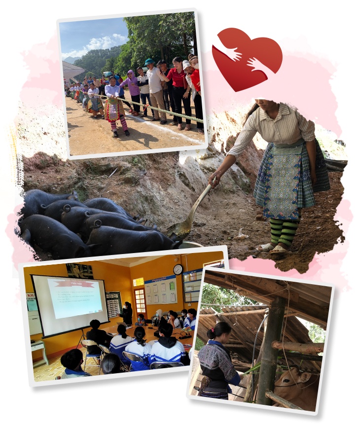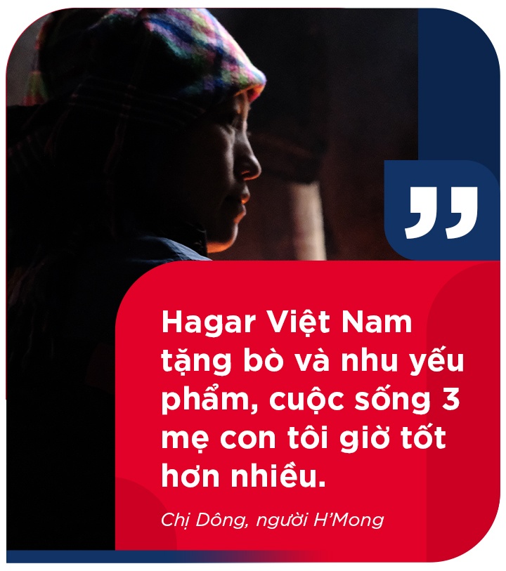 Tương tự Mỳ, chị Dông thông qua Hội Liên hiệp Phụ nữ huyện Mù Cang Chải, được Hagar Việt Nam hỗ trợ nhu yếu phẩm cho mẹ con chị để đảm bảo sức khỏe. Ngoài ra, chị được trao tặng con giống (bò) cùng chuồng trại. Thu nhập từ chăn nuôi bò giúp chị đảm bảo cuộc sống cho bản thân và con nhỏ.