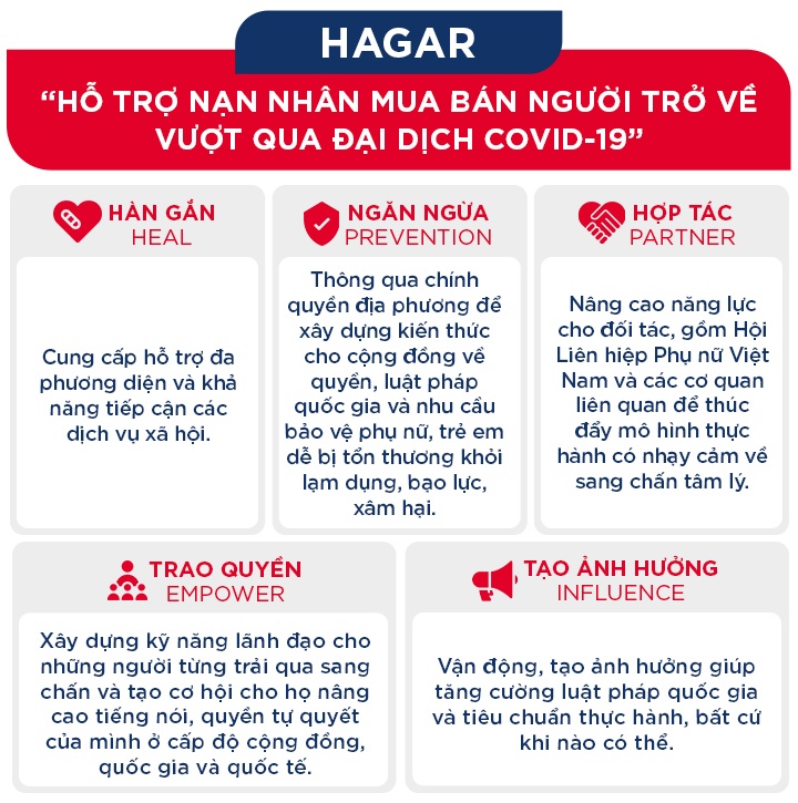 Với 13 năm kinh nghiệm trong việc hỗ trợ phụ nữ và trẻ em chịu sang chấn do nạn mua bán người, bạo lực và xâm hại, Hagar Việt Nam là một trong những tổ chức đi đầu trong việc áp dụng cách tiếp cận dựa trên hiểu biết về sang chấn. Nhờ đó, đơn vị tập trung vào thế mạnh của từng cá nhân, thúc đẩy họ phát triển khả năng tự chủ và khơi dậy sức mạnh nội tại của bản thân.
