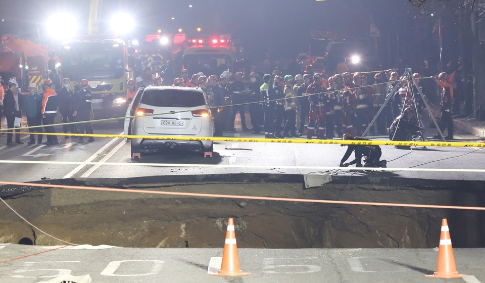 Lực lượng cứu hộ tiến hành công tác giải cứu tại hiện trường xuát hiện hố tử thần ở thủ đô Seoul, Hà Quấn, ngày 24/3/2025. Anh: Yonhap. |
