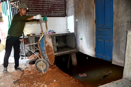 | Hố sụt lún lớn ngay trong nhà ông Bùi Bá Thành. |