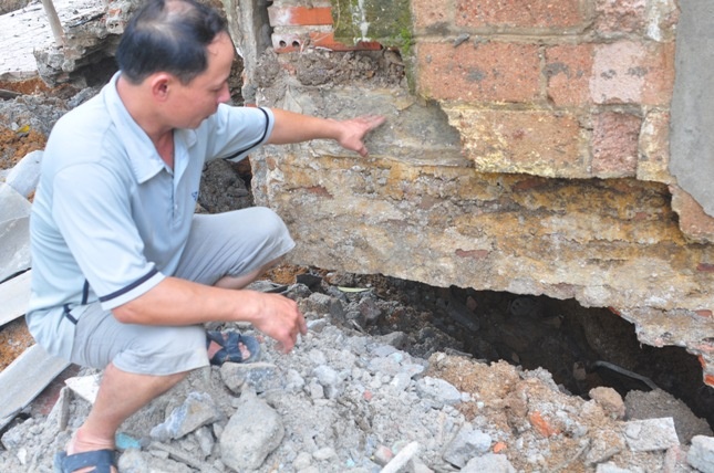 Anh Dũng chỉ dầm nhà bị trơ lõi vì hố tử thần. |