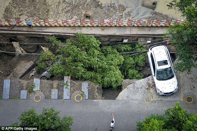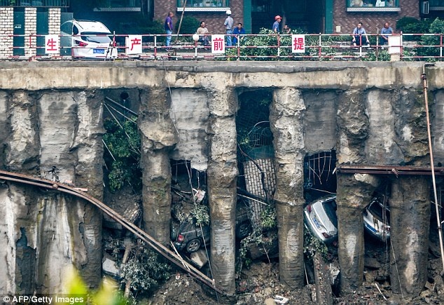| 5 ô tô lún sâu tới 9 m vào trong lòng đất, còn một xe khác vẫn treo lơ lửng trên miệng của tảng bê tông. Ảnh: AFP |