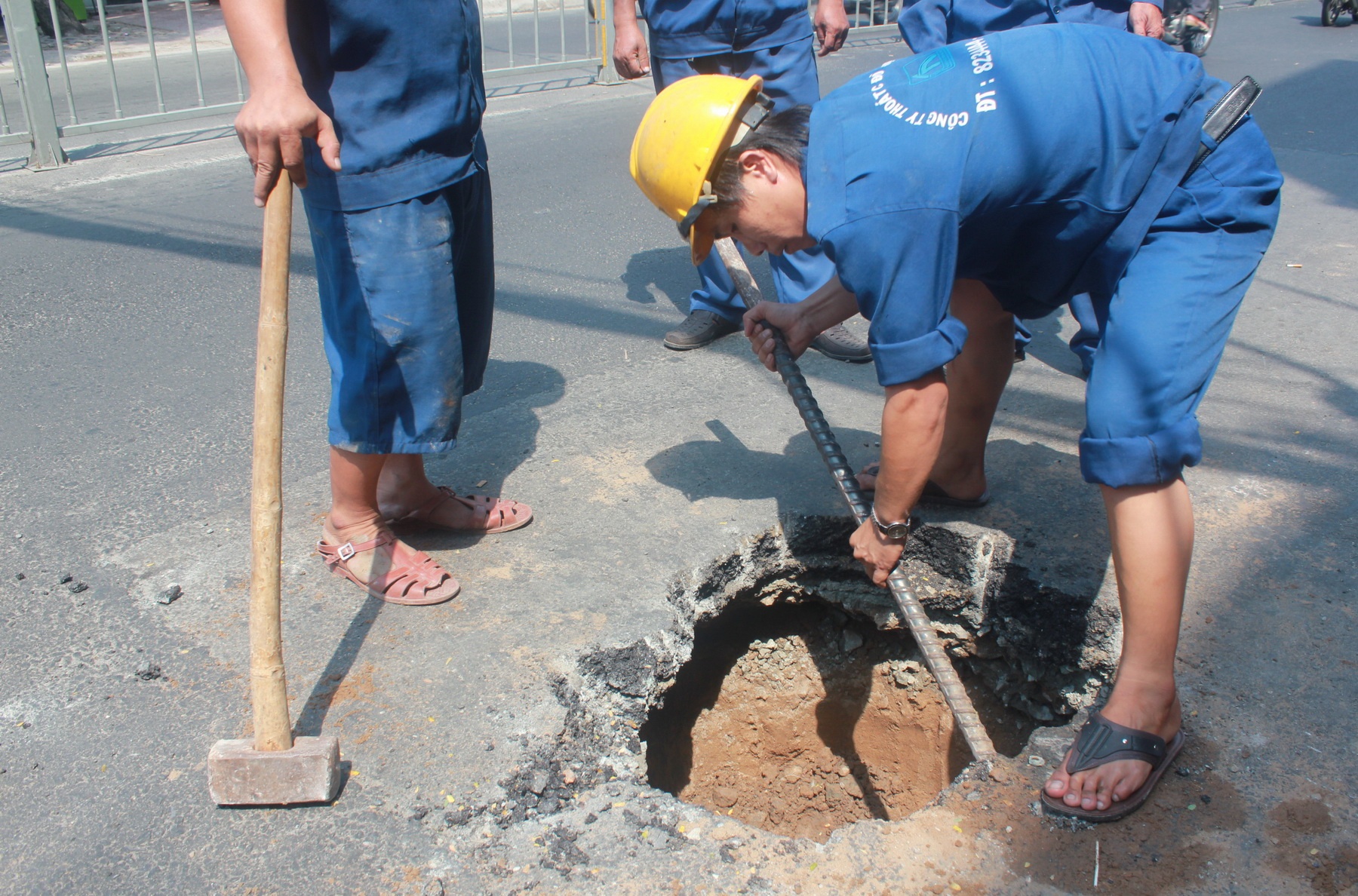 | Sau khi rào chắn hiện trường, công nhân công ty TNHH MTV thoát nước đô thị TP.HCM tiến hành xử lý sự cố, lập lại mặt đường. |