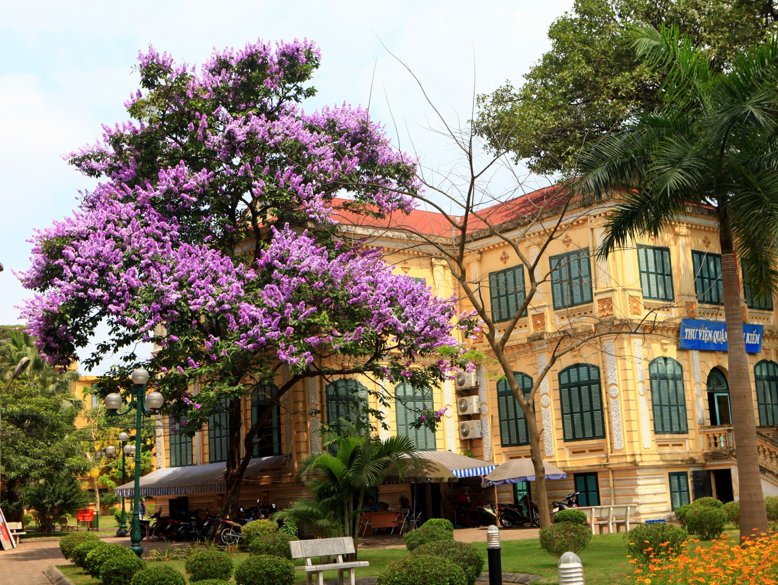 Những vòm lá thấp thoáng từng cụm hoa tím nở xoè, nổi bật. Những dây hoa tím đong đưa trong nắng, trông thật thảnh thơi.