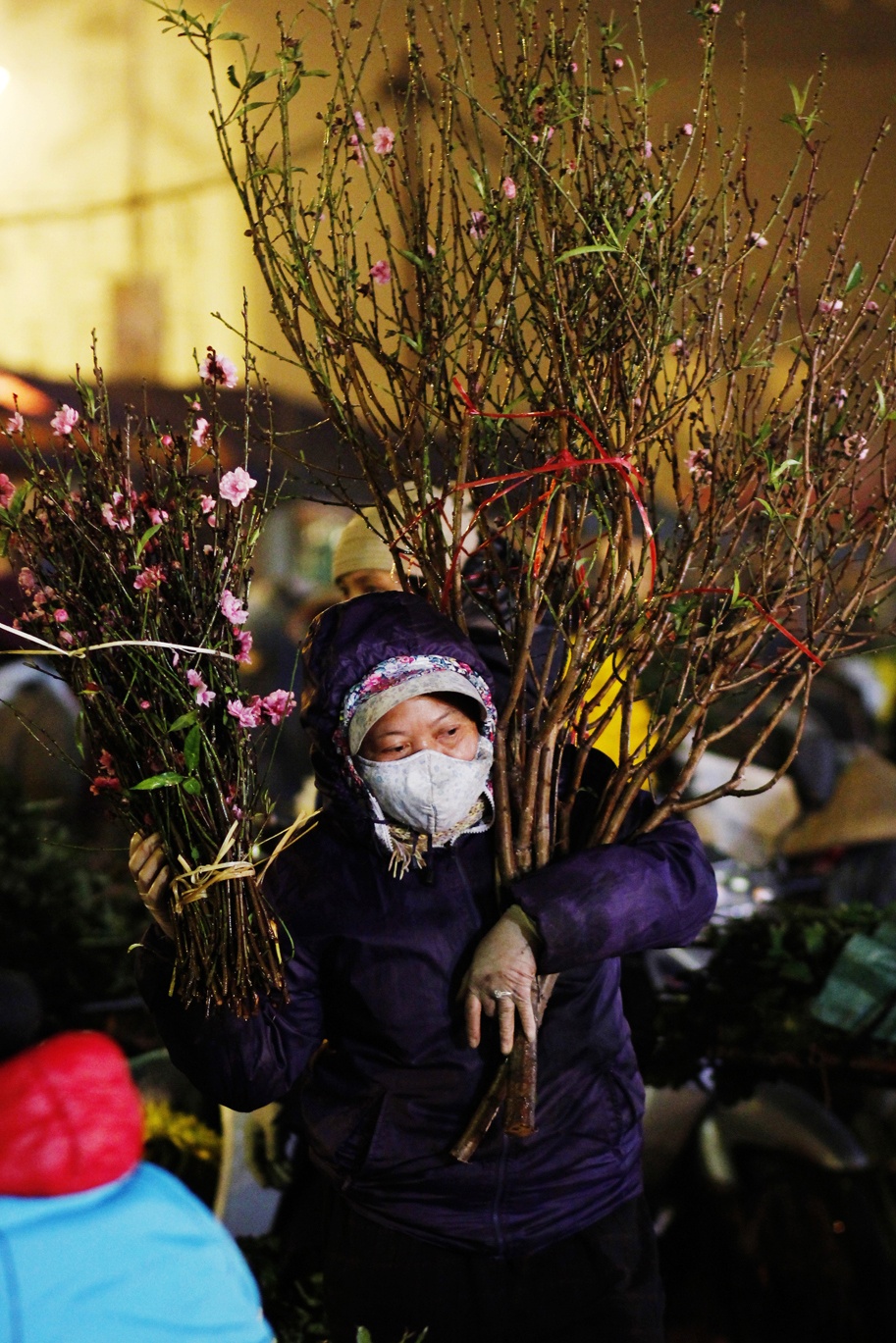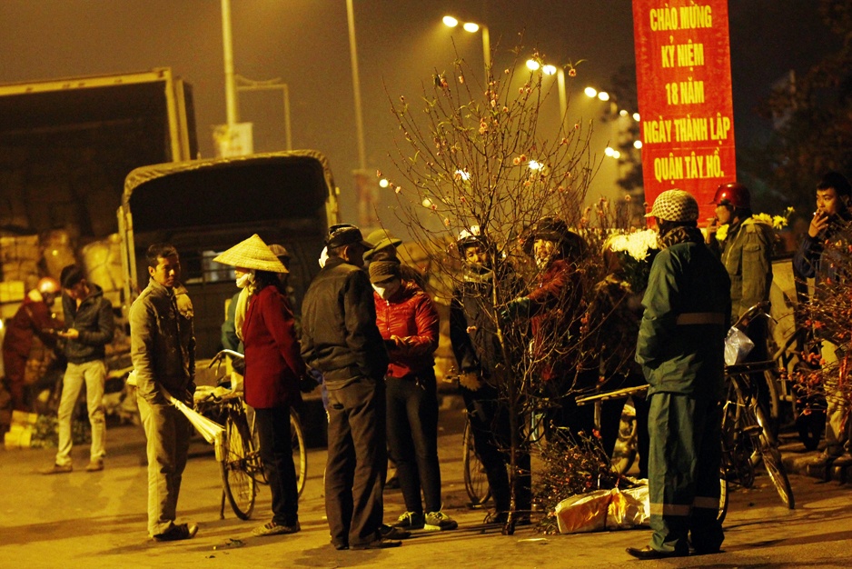 Hoa đào tại chợ Quảng An thường có giá mềm hơn so với các nơi khác do phần lớn là của những người dân tự trồng đem đi bán. |
