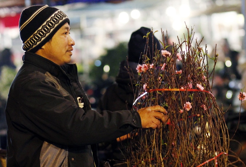 Anh Thăng, một người dân ở Cầu Giấy đã dậy sớm để đến chợ chọn mua cành đào về chơi với mong muốn có không khí Tết sớm trong nhà. |