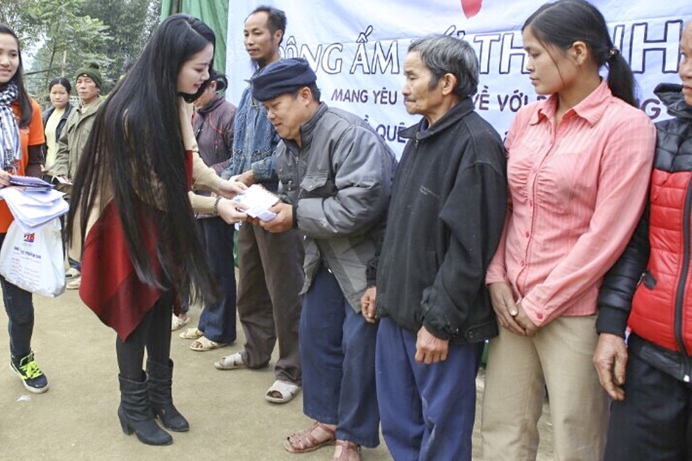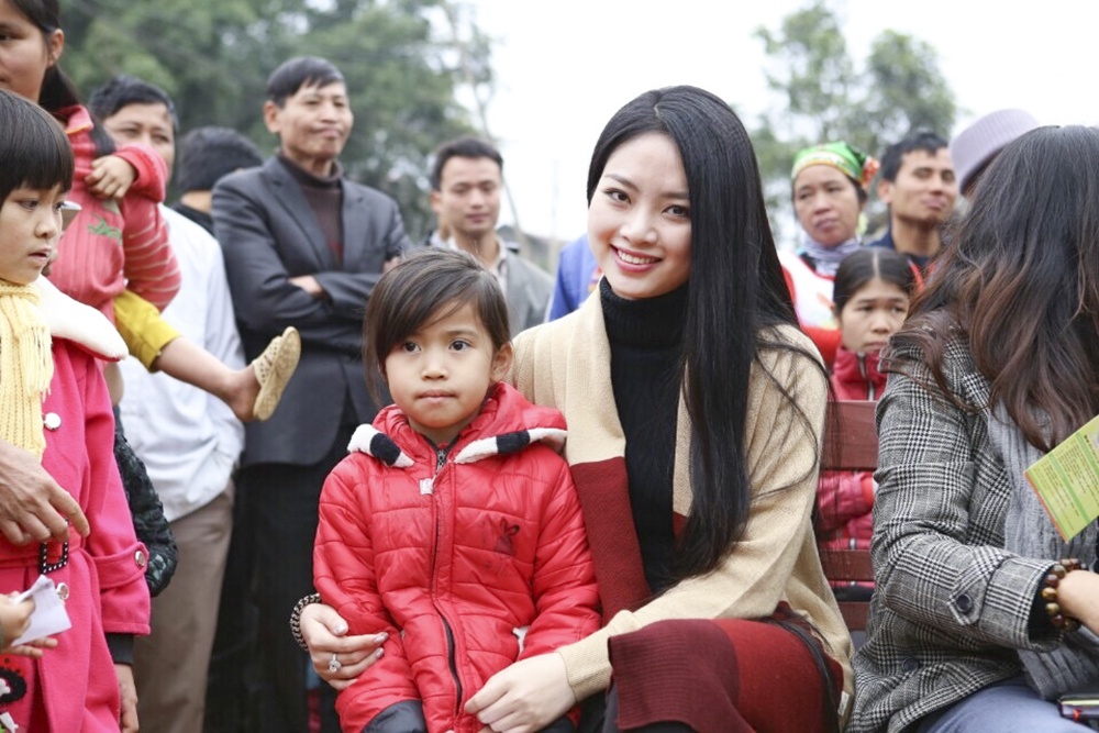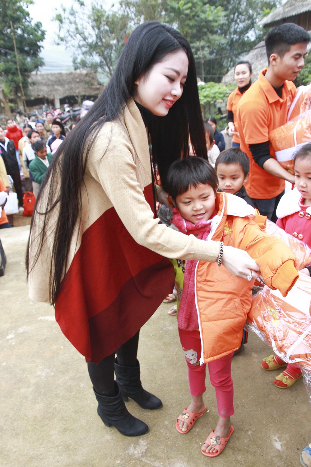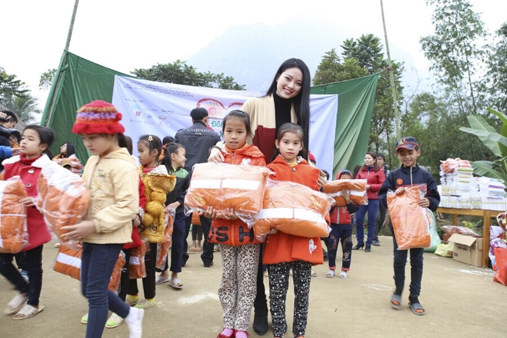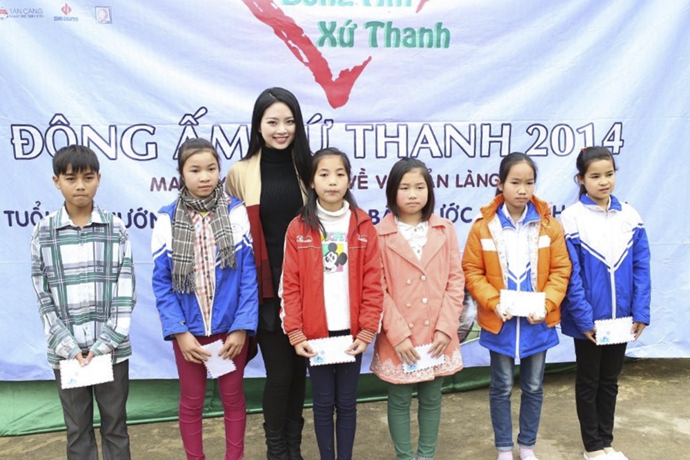 | Tại đây, người đẹp sinh năm 1993 đã trao những suất quà từ thiện cho những người dân có hoàn cảnh khó khăn ở huyện miền núi phía Tây của Thanh Hóa. |